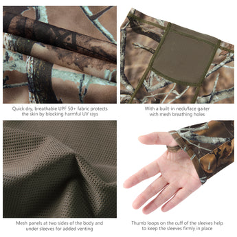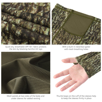 This Bassdash camo shirt women hoodie, made from 84% Polyester and 16% Spandex, offers 4-way stretch, breathability, and quick-drying comfort. With UPF 50+ for superior sun protection, mesh side panels enhance airflow. The built-in hood and mesh-ventilated neck gaiter provide coverage and easy breathing. Its patented camouflage design helps you blend into your surroundings, while thumb loops keep sleeves in place. Perfect for hunting, fishing, hiking, and various outdoor adventures.