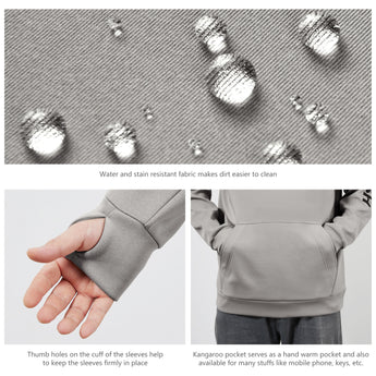 Big kangaroo pocket serves as a hand warm pocket and is also available for personal stuffs like mobile phone, keys, etc; Thumb holes on the sleeve cuffs help to keep the sleeves firmly in place.