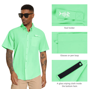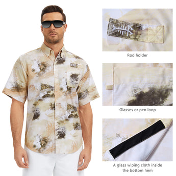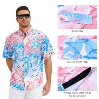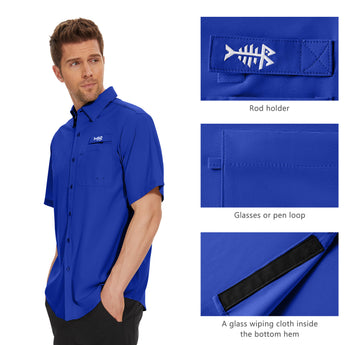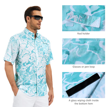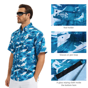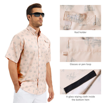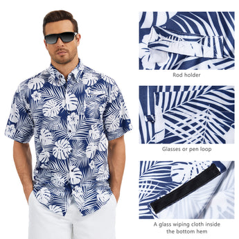 - Handy feature design: A rod holder loop at the left chest; One chest pocket and a glasses or pen loop; A wiping cloth inside the bottom hem and a spare button for the shirt; A small band fashioned at the back of the shirt, by which the shirt can be hung up.