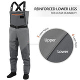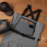 These high-quality nylon breathable waders are built for durability. They have a strong 3-layer upper and a reinforced 4-layer lower, making them tough enough for rough conditions. The waders include a large water resistant zipper chest pocket, a flip-out pocket, two D-clip gear attachments and a webbed daisy chain for easy access to your essentials. You can adjust the fit with elastic suspenders, a chest drawstring, and a quick-release belt. The gravel guard keeps debris out, and the neoprene stocking feet provide comfort and resistance to wear. Each pair is tested to ensure they are 100% waterproof, so you can fish with confidence. You also get a mesh storage bag and a repair kit for easy maintenance. Upgrade your fishing trips with these reliable waders!