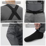 Elastic adjustable suspenders and an inner chest draw cord allows for a custom fit; An adjustable 1.5-inch wide belt with a durable quick-release buckle; A self-fabric gravel guard with a gathered elastic bottom hem.
