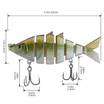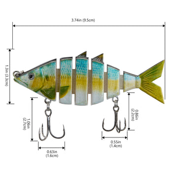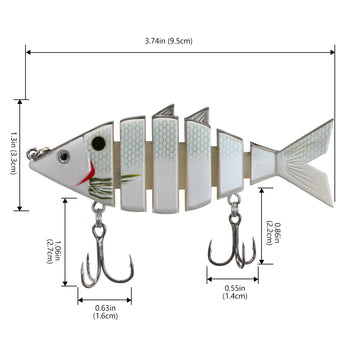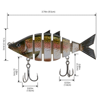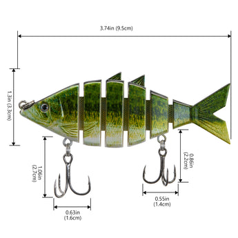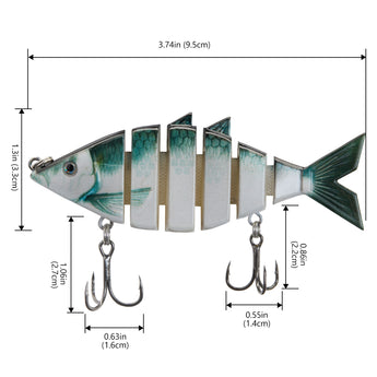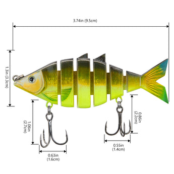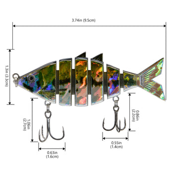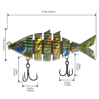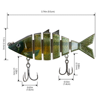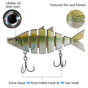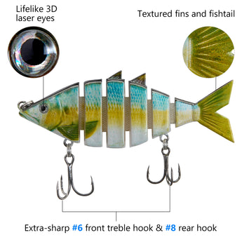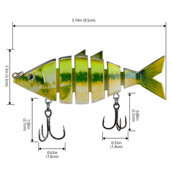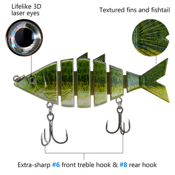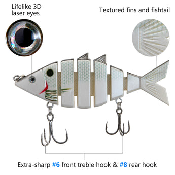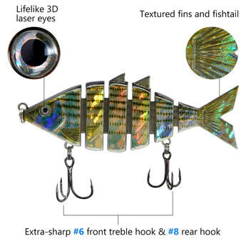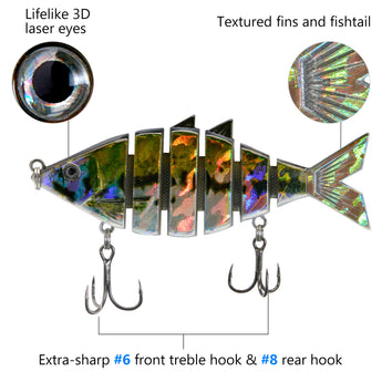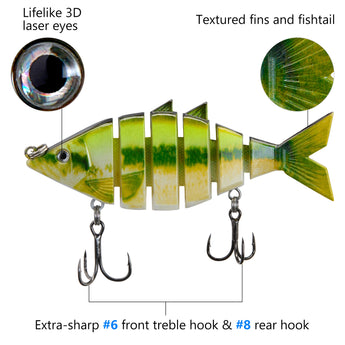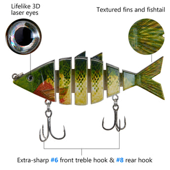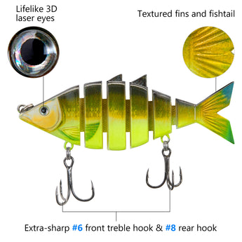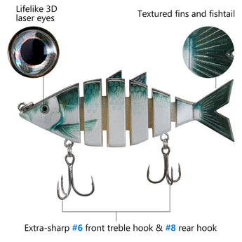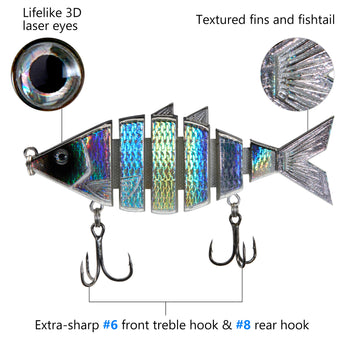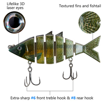 - Innovative Angled Segment Cuts: each joint is angled cut rather than straight-cut, setting it apart from standard multi-jointed lures and allowing for a more lifelike S-shaped swim action