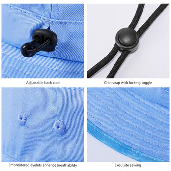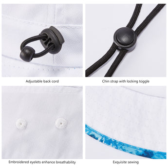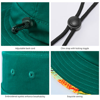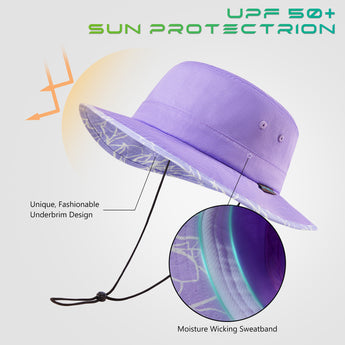 With UPF 50+ rating, breathable fabric, premium construction, and patterned under brim, this bucket sun hat will deliver performance, comfort, and style. It is perfect to wear while you enjoy hiking, riding, fishing, gardening, etc. Get ready to have some fun in the sun! Drawstring at the back for adjustable sizing; Removable chin strap with locking toggle for windy days; Sweatband prevents sweat from getting into your eyes. Designed to be folded easily, it can be conveniently packed into your handbag or backpack. Ideal for all types of outdoor activities; Easy care: hand wash, dry in shade.