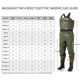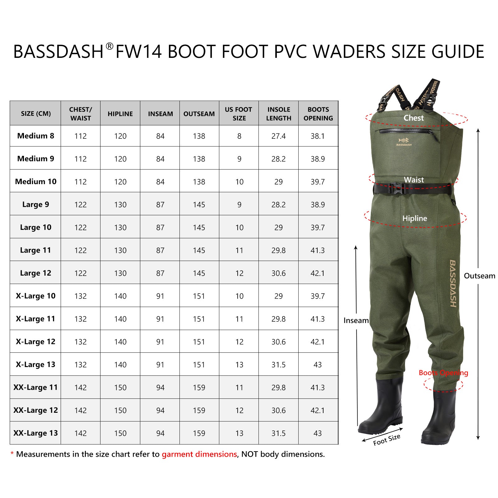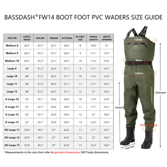 1. Don't forget to purchase a size that is loose enough to accommodate wading pants and a fleece top underneath - usually the chest/waist measurements of the waders need to be at least 6~10 inches larger than your body chest/waist sizes, depending on the thickness of your layers underneath.
