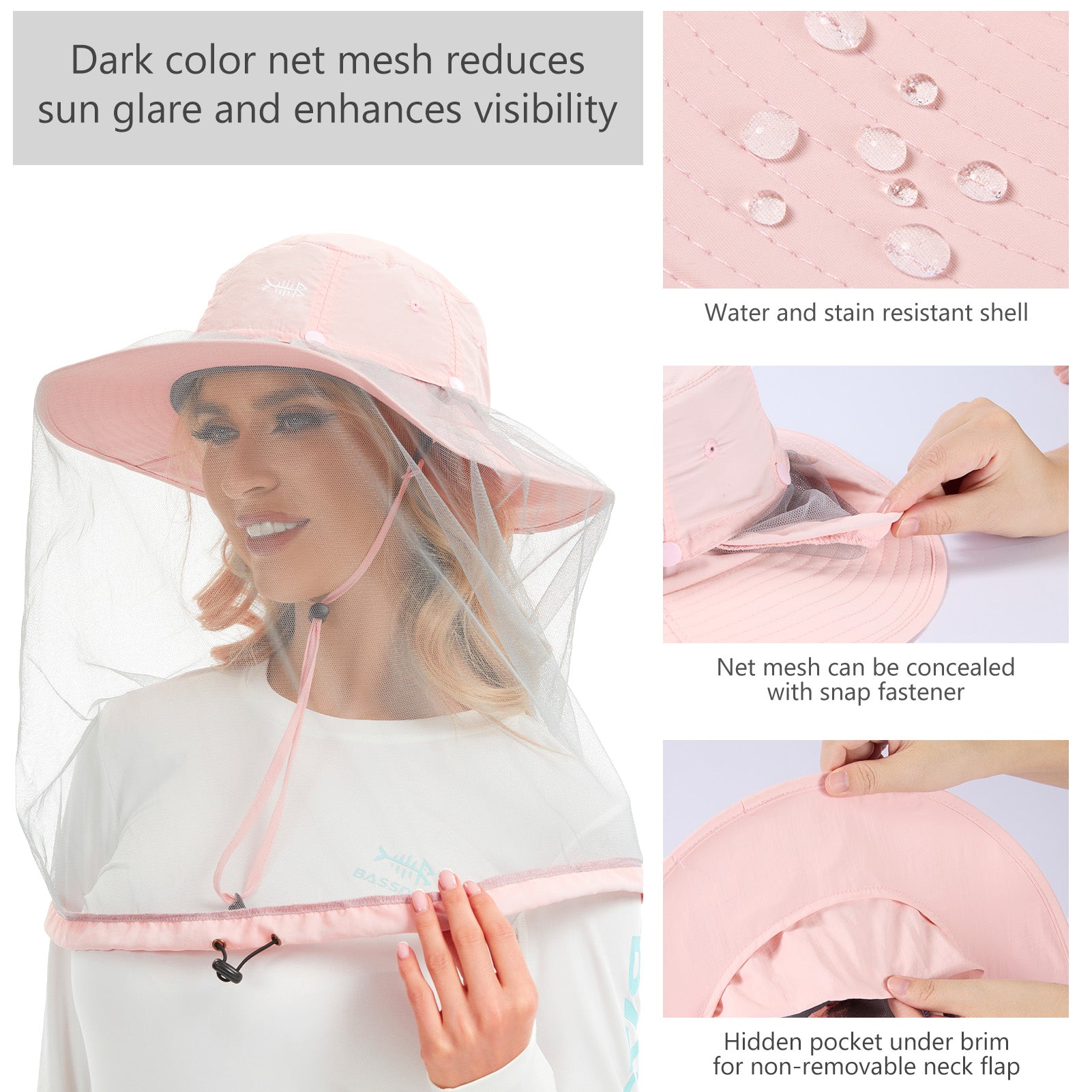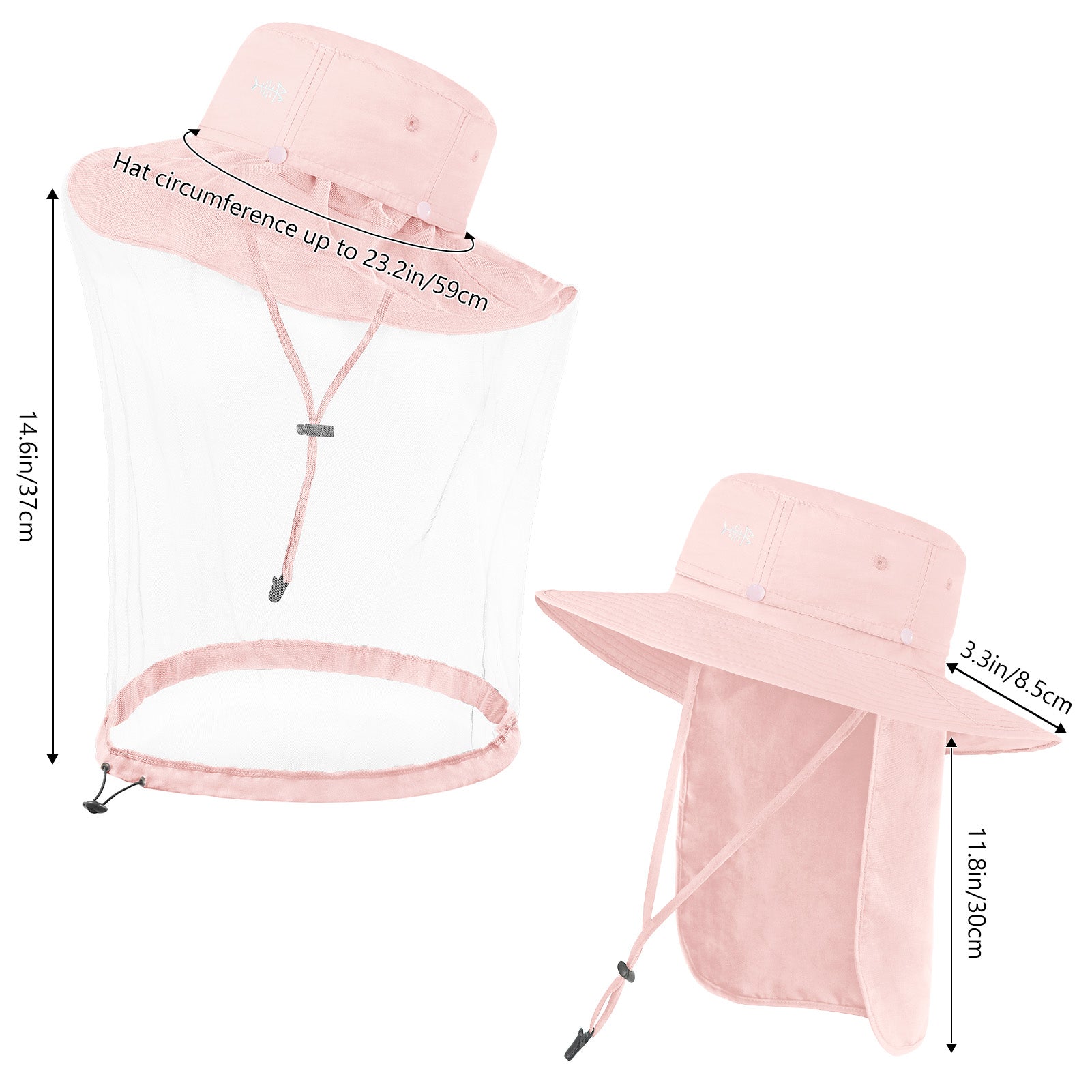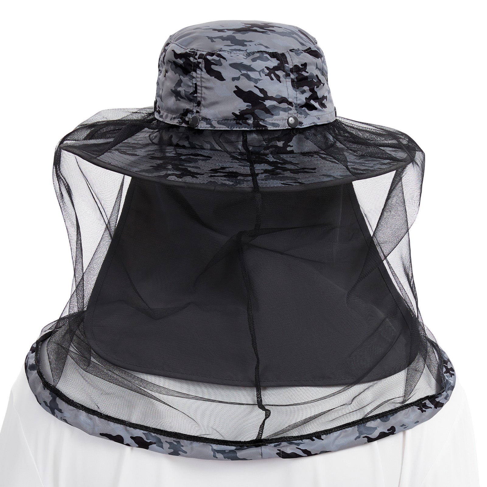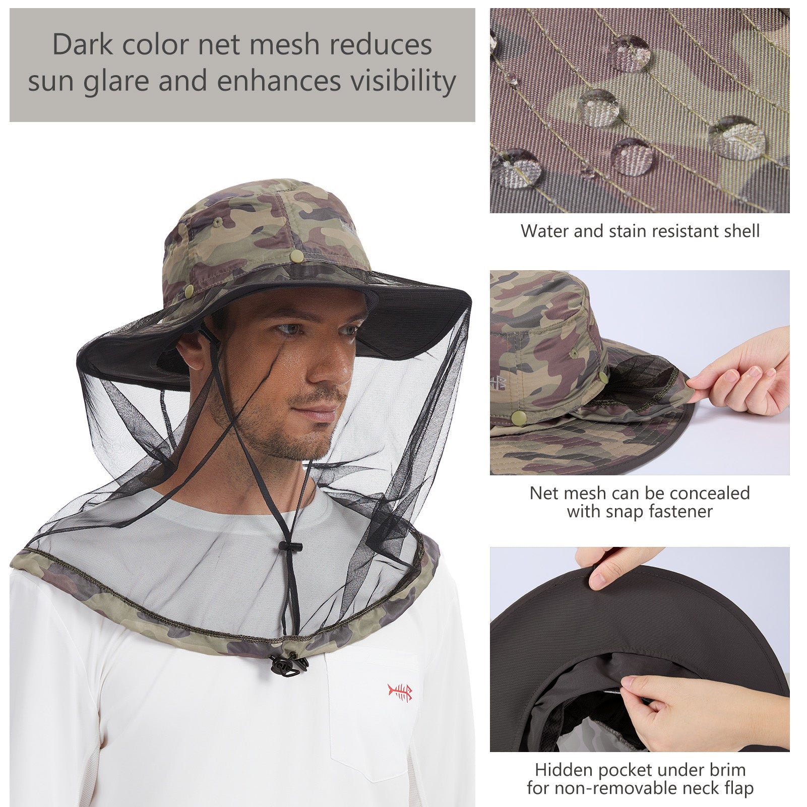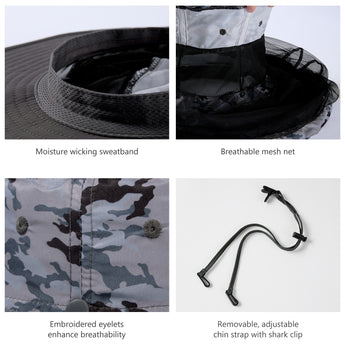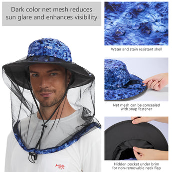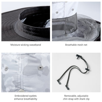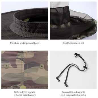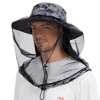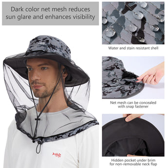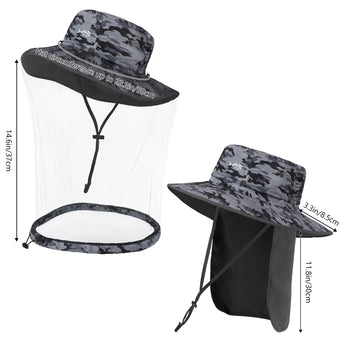 • Features a 14.6in long mosquito net to protect your face and neck from those pesky mosquitoes, midges, and other biting bugs; Dark color net mesh reduces sun glare and enhances visibility; The net mesh can be hidden when not in use - simply roll it up and fold it into the downward pocket around your hat - allowing the hat to be a regular boonie sun hat.