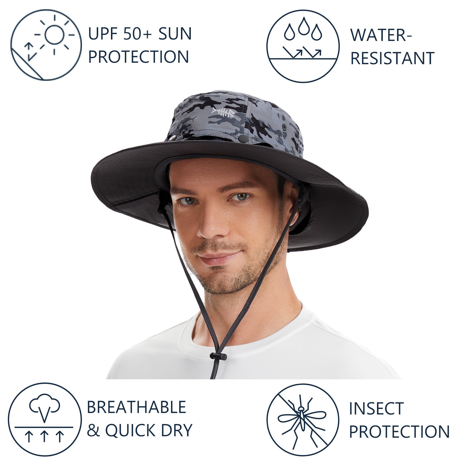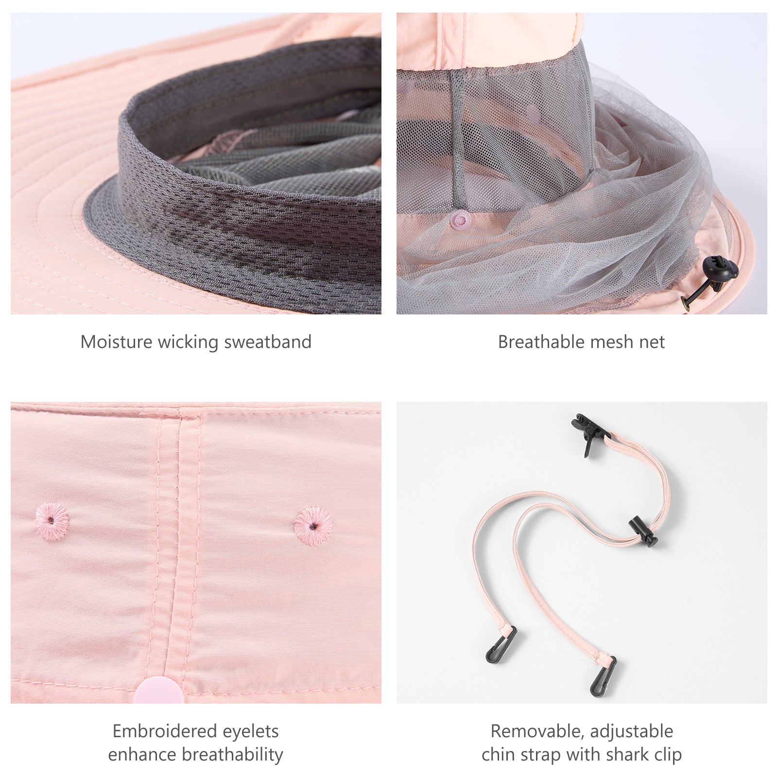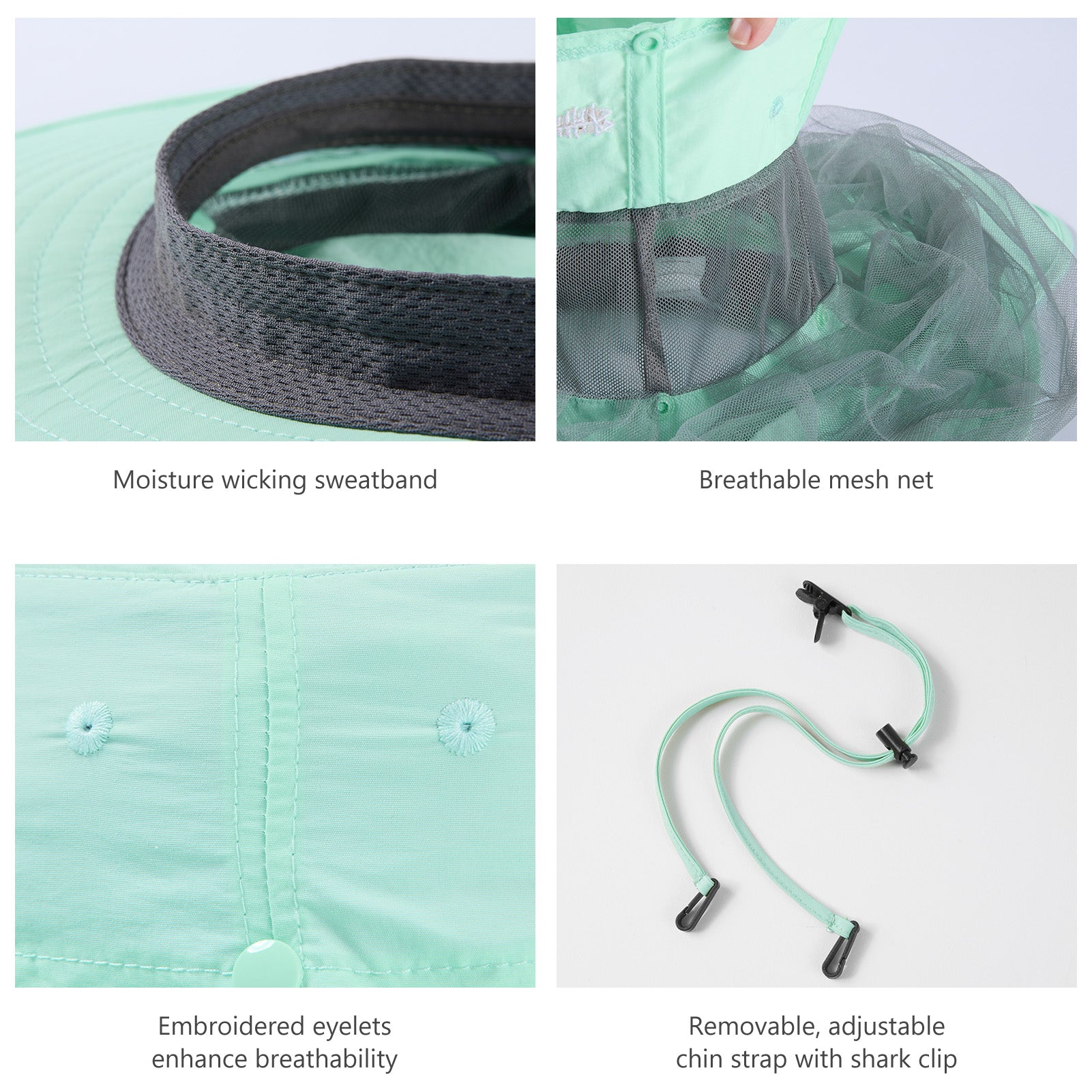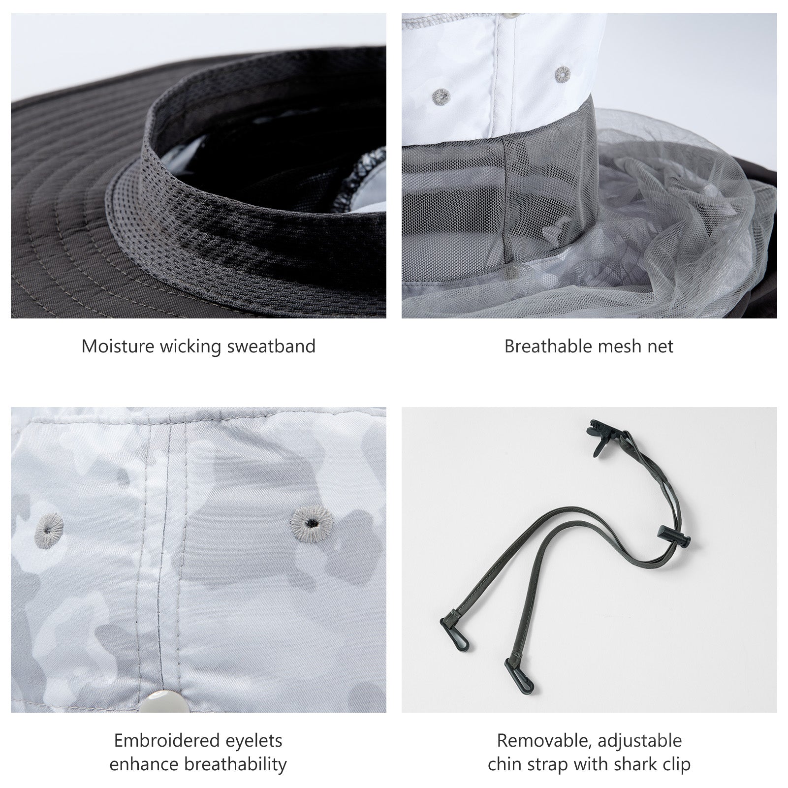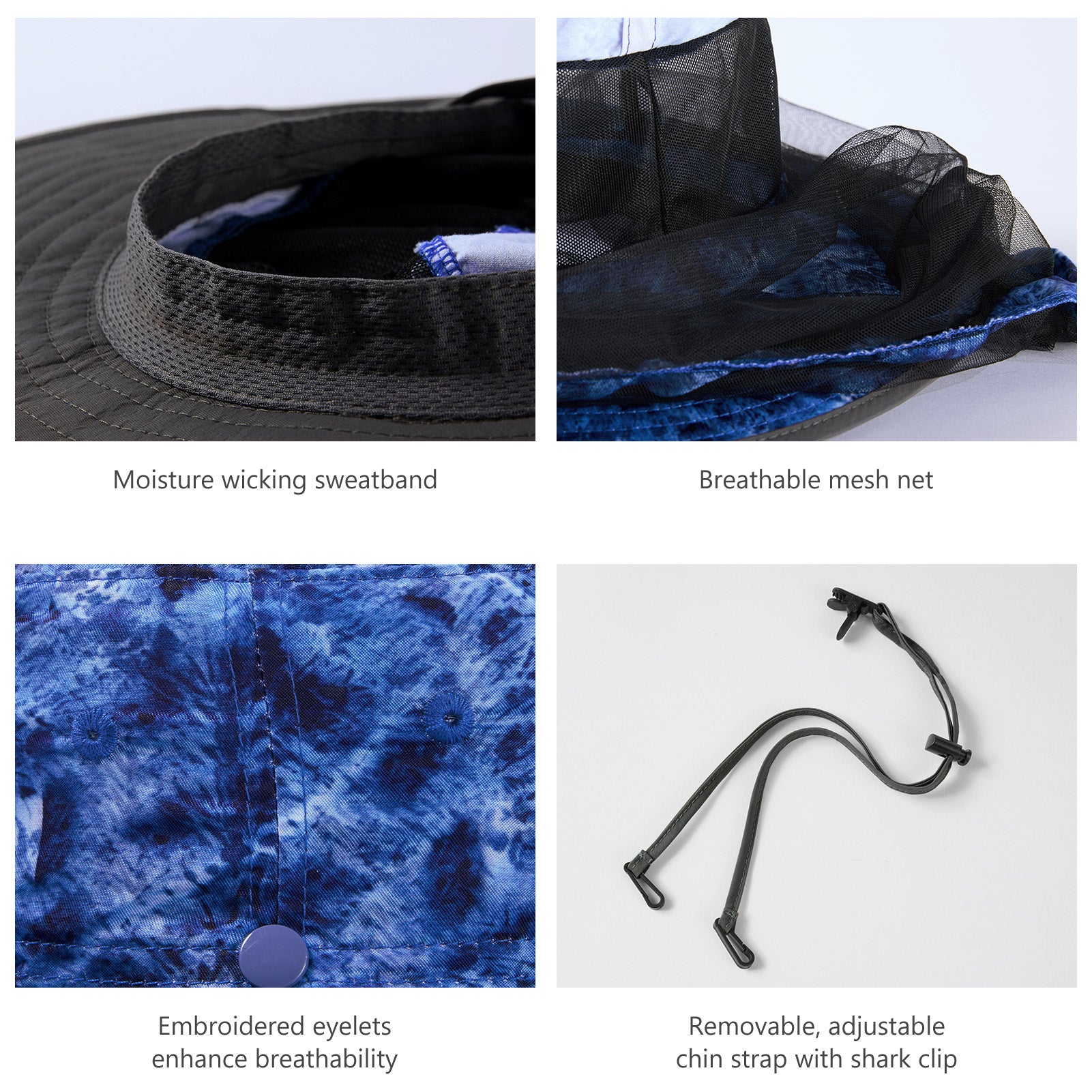 • Built-in sweatband prevents sweat from getting into your eyes; Embroidered eyelets facilitate breathability; Removable, adjustable chin strap with locking toggle ensures the hat works well on windy days, and with a shark clip on the strap, the hat can be attached to your other gears (like backpack, clothes, etc.) when not in use.