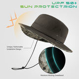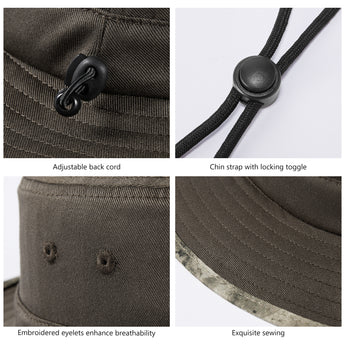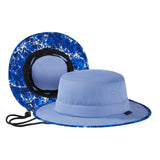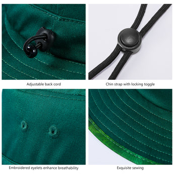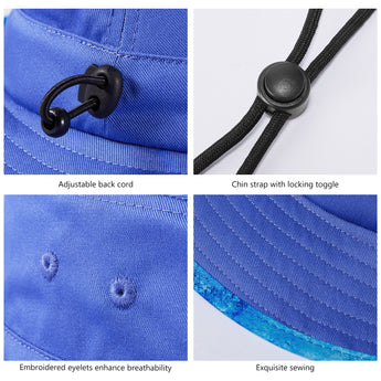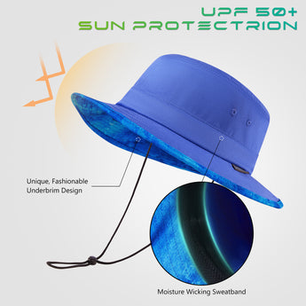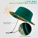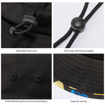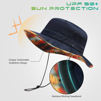 With UPF 50+ rating, breathable fabric, premium construction, and patterned under brim, this bucket sun hat will deliver performance, comfort, and style. It is perfect to wear while you enjoy hiking, riding, fishing, gardening, etc. Get ready to have some fun in the sun! Drawstring at the back for adjustable sizing; Removable chin strap with locking toggle for windy days; Sweatband prevents sweat from getting into your eyes. Designed to be folded easily, it can be conveniently packed into your handbag or backpack. Ideal for all types of outdoor activities; Easy care: hand wash, dry in shade.