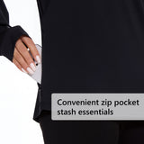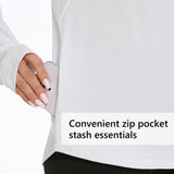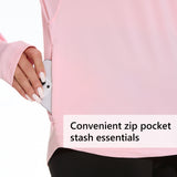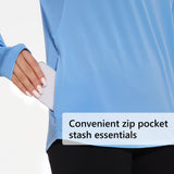 This sun hoodie features a hidden zippered pocket on the front bottom right for securely storing small essentials such as cards, keys, and cash, adding a practical touch.