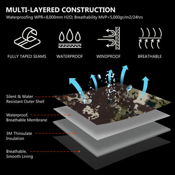 Performance Multi-Layered Construction: Silent outer fabric is designed to be essentially noiseless making for a near-silent garment when stalking through the woods, while the inner waterproof, breathable membrane and the heat sealed seams ensure they remain 100% waterproof; 3M Thinsulate Insulation; Soft yet durable lining.
