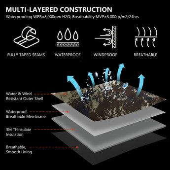 Multi-layered construction - Durable ripstop outer layer fabric resists thorns; Waterproof, breathable inner membrane and sealed seams ensure 100% watertightness; 3M Thinsulate Insulation; With skin-friendly lining.