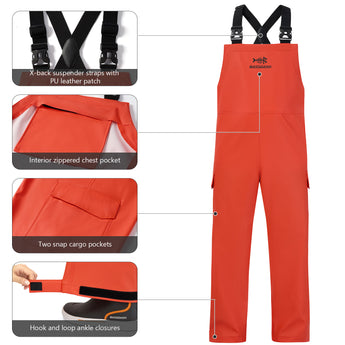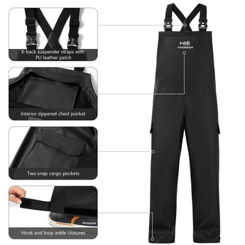 Crafted from durable PU-coated polyester fabric using a heat-pressing seaming process, these fishing bibs provide reliable waterproofing for tough environments. Designed to improve wearer comfort and guarantee high mobility during activities like fishing and sailing on rainy days. Other features include heavy-duty, adjustable elastic suspenders with quick-release buckles, an interior chest zippered pocket, and hook-and-loop adjustable cuffs. They are easy to put on and take off.