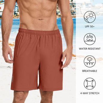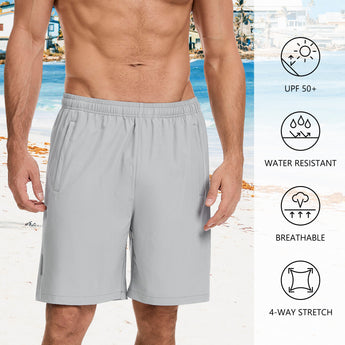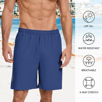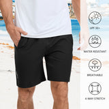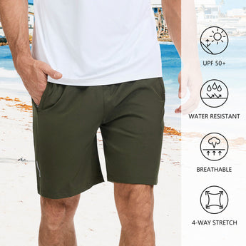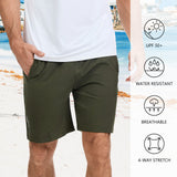 These water-resistant shorts are made from 90% polyester and 10% spandex, offering stretch, breathability, and quick-drying properties. The advanced UPF 50+ fabric blocks 98% of harmful UV rays to protect your skin. With a water-resistant coating, the shorts stay dry and clean. Featuring 2 side and 1 back zipper pockets for secure storage. The 7-inch inseam and relaxed fit with an elastic waistband and adjustable drawstring ensure comfort and flexibility for various activities like hiking, fishing, golf, and travel.