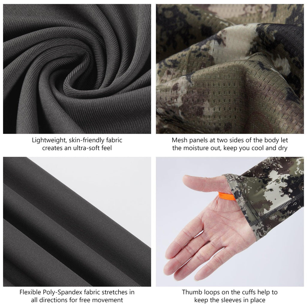 Made of UPF 50+, 4-way stretchy, lightweight fabric, the BASSDASH men's hunting long sleeve shirt protects your skin from the sun and provides free movement. The breathable fabric along with the mesh panels at two sides of the body provide sufficient breathability. The camouflage printing patterns ensure better concealment in different terrains and environments.