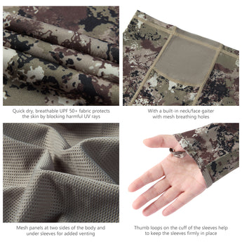 This Bassdash camo shirt women hoodie, made from 84% Polyester and 16% Spandex, offers 4-way stretch, breathability, and quick-drying comfort. With UPF 50+ for superior sun protection, mesh side panels enhance airflow. The built-in hood and mesh-ventilated neck gaiter provide coverage and easy breathing. Its patented camouflage design helps you blend into your surroundings, while thumb loops keep sleeves in place. Perfect for hunting, fishing, hiking, and various outdoor adventures.