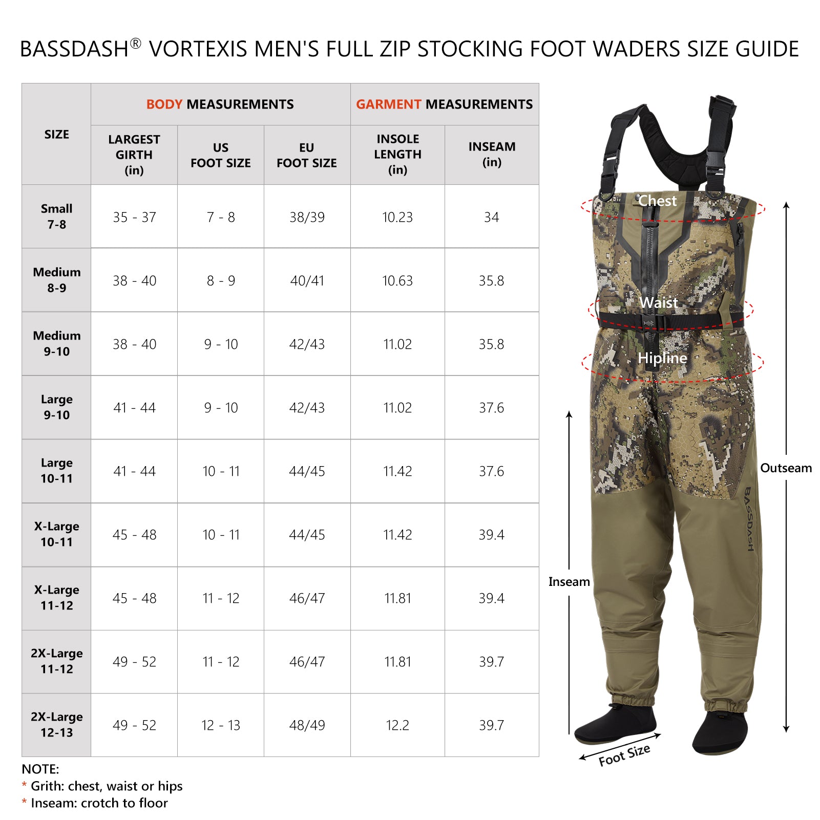1. Don't forget to purchase a size that is loose enough to accommodate wading pants and a fleece top underneath - usually the chest/waist measurements of the waders need to be at least 6~10 inches larger than your body chest/waist sizes, depending on the thickness of your layers underneath.