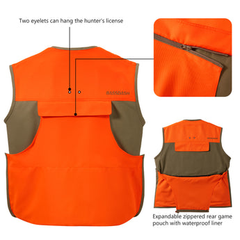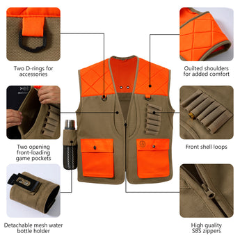 • Quilted shoulders to reduce the recoil of your firearm; Two D-rings on the chest to attach small hunting gear or accessories; Six exterior shell holders for fast reload; High quality SBS zippers applied; A detachable mesh water bottle holder makes it easier for you to carry water for yourself or your four legged friends; Two eyelets on the back can hang your hunter's license.
