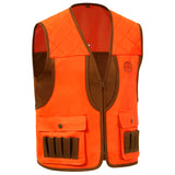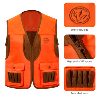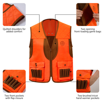 This BASSDASH youth hunting vest is designed with over 144 square inches of blaze orange fabric to meet state requirements and ensure visibility. It features multiple pockets, including game bags, button-flap pockets, hand warmer pockets, and a large expandable, blood-proof back pouch for organizing gear and prey. Additional highlights include a quilted shoulder patch for comfort, 10 front shell loops, high-quality SBS zippers, and two back eyelets for hanging a hunter's license. This vest delivers adult-level performance and ease for extended outdoor adventures.