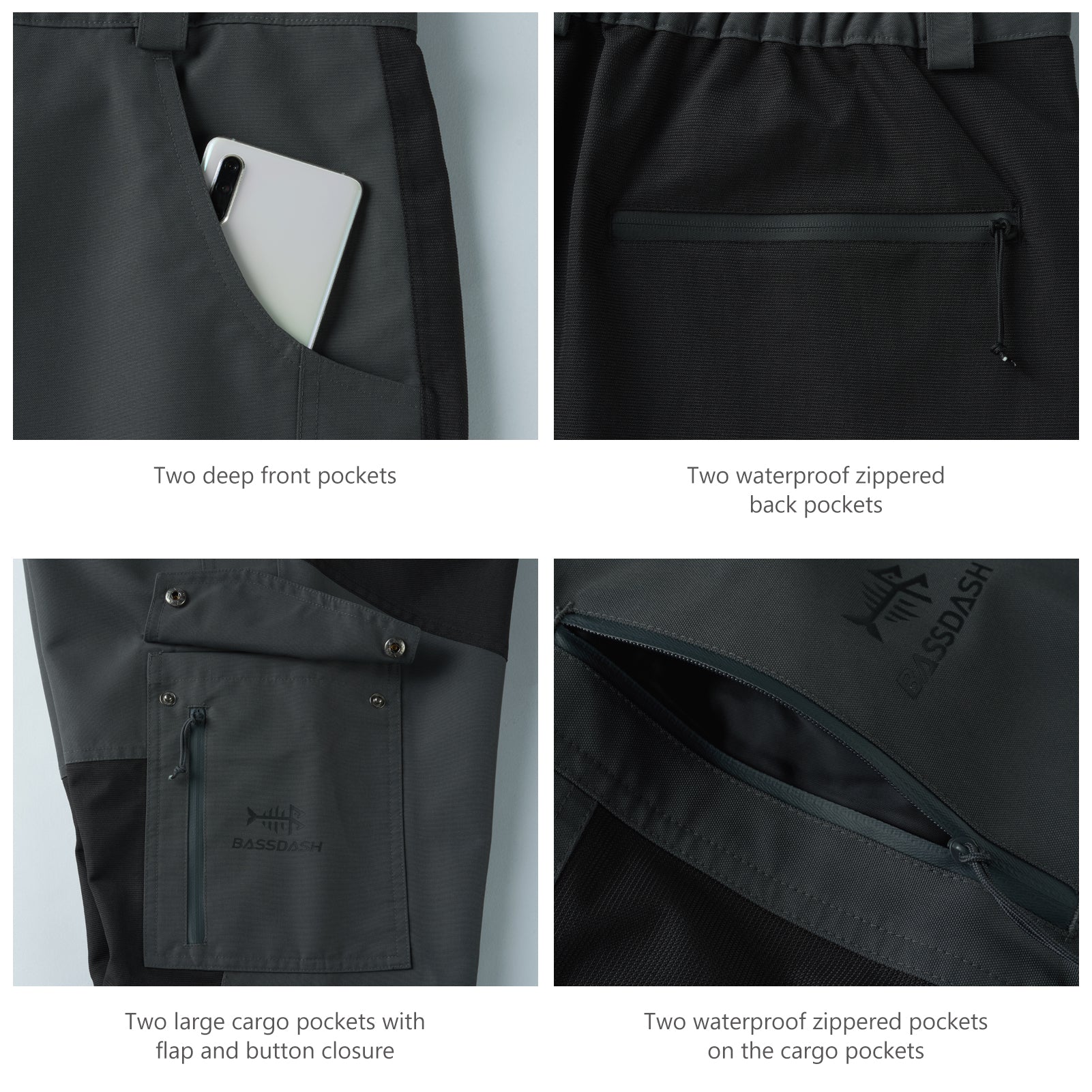 - Eight-pocket design for carrying your essentials: Two deep front pockets with reinforced edge for knife clip, two cargo pockets with flap and button closure, two waterproof zippered pockets on the cargo pockets, and two waterproof zippered back pockets.