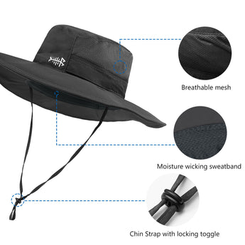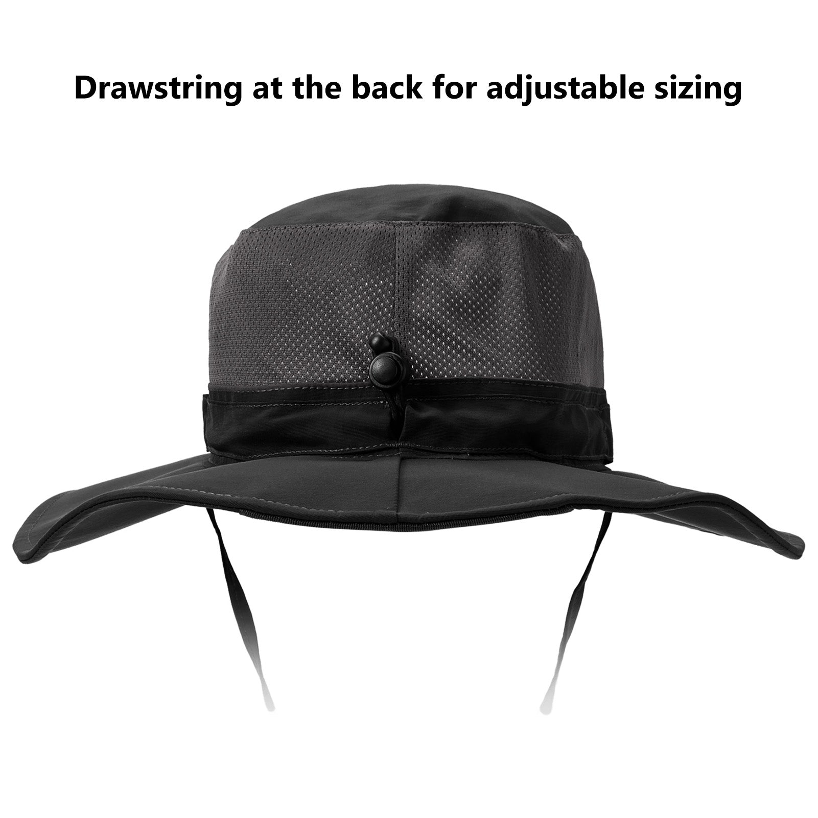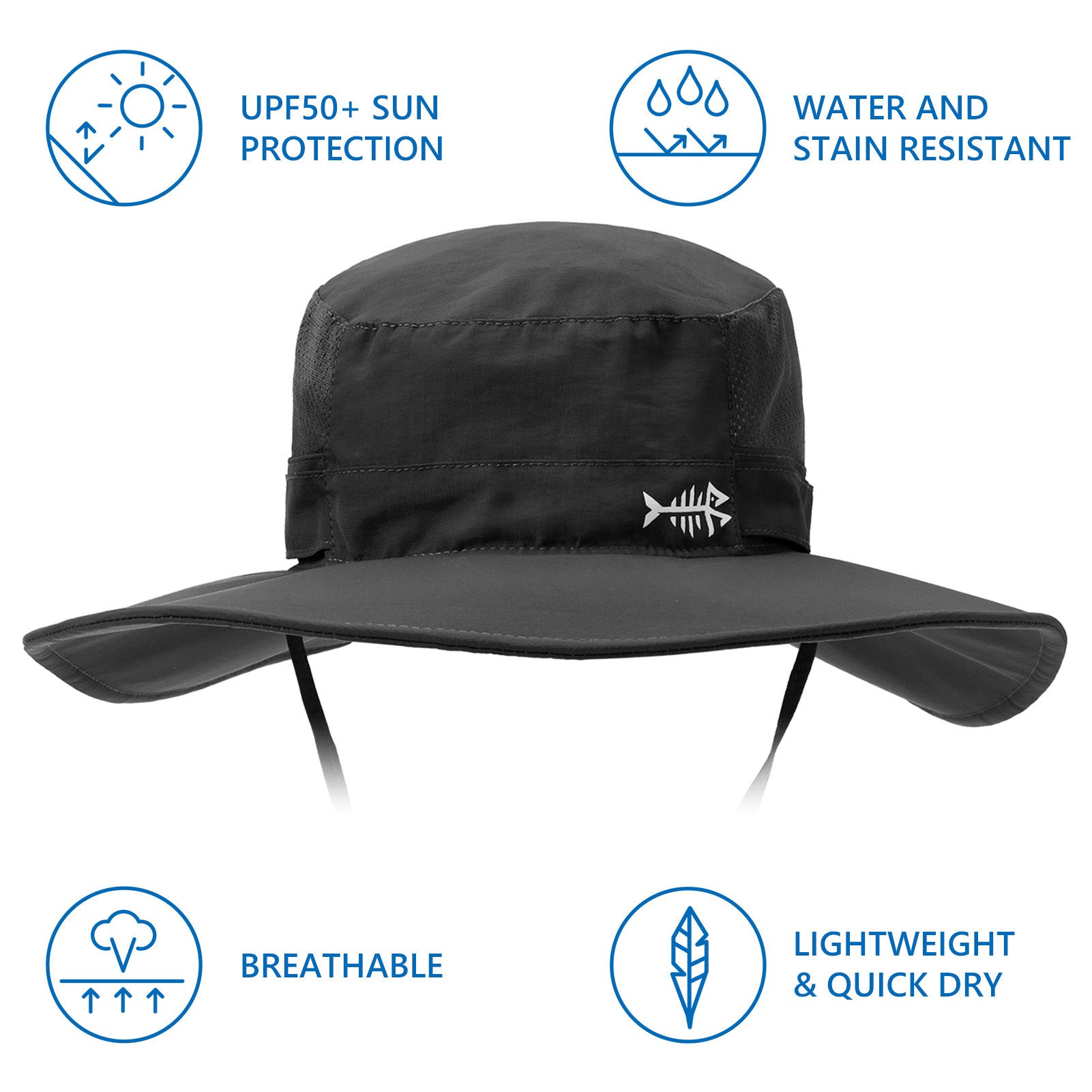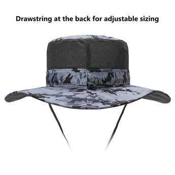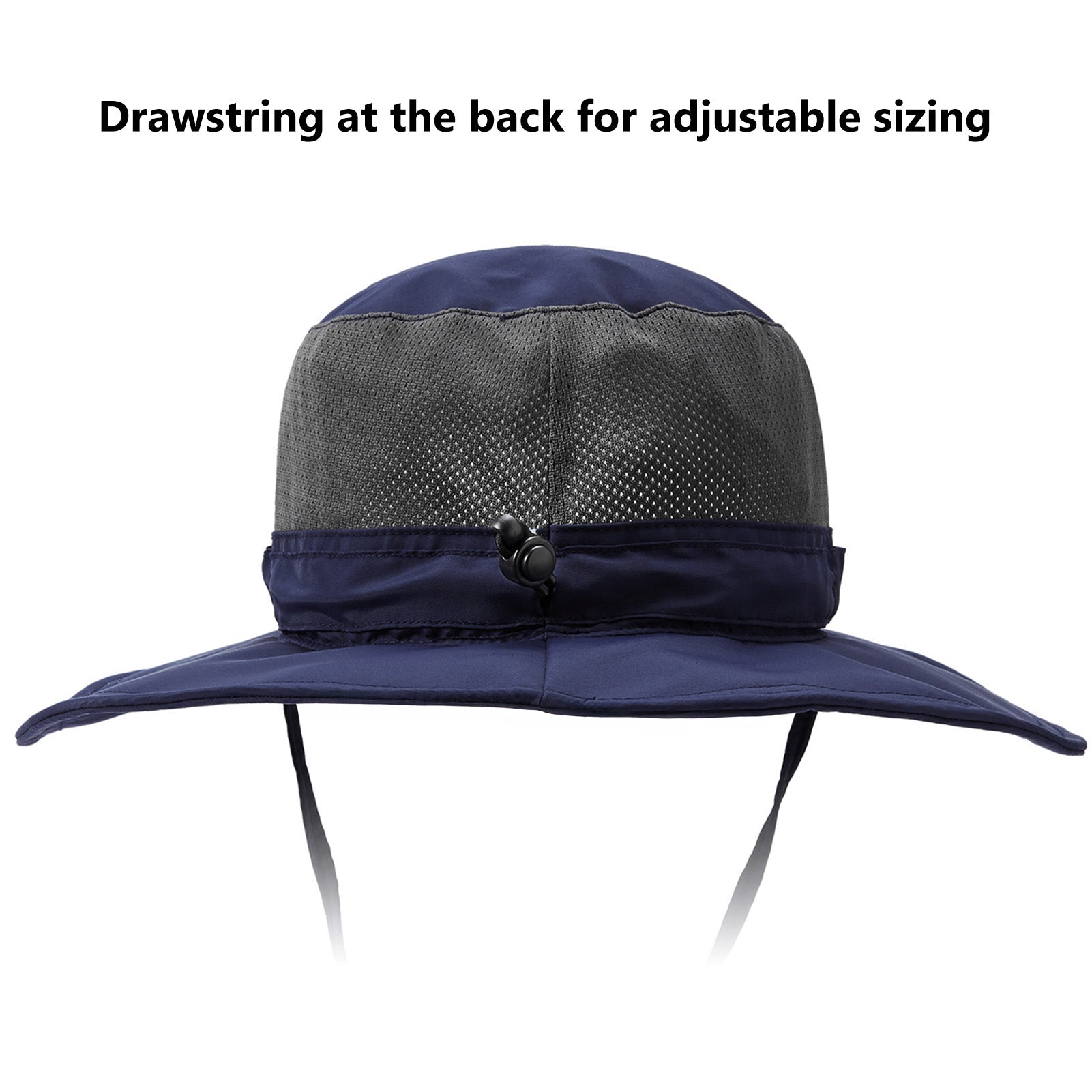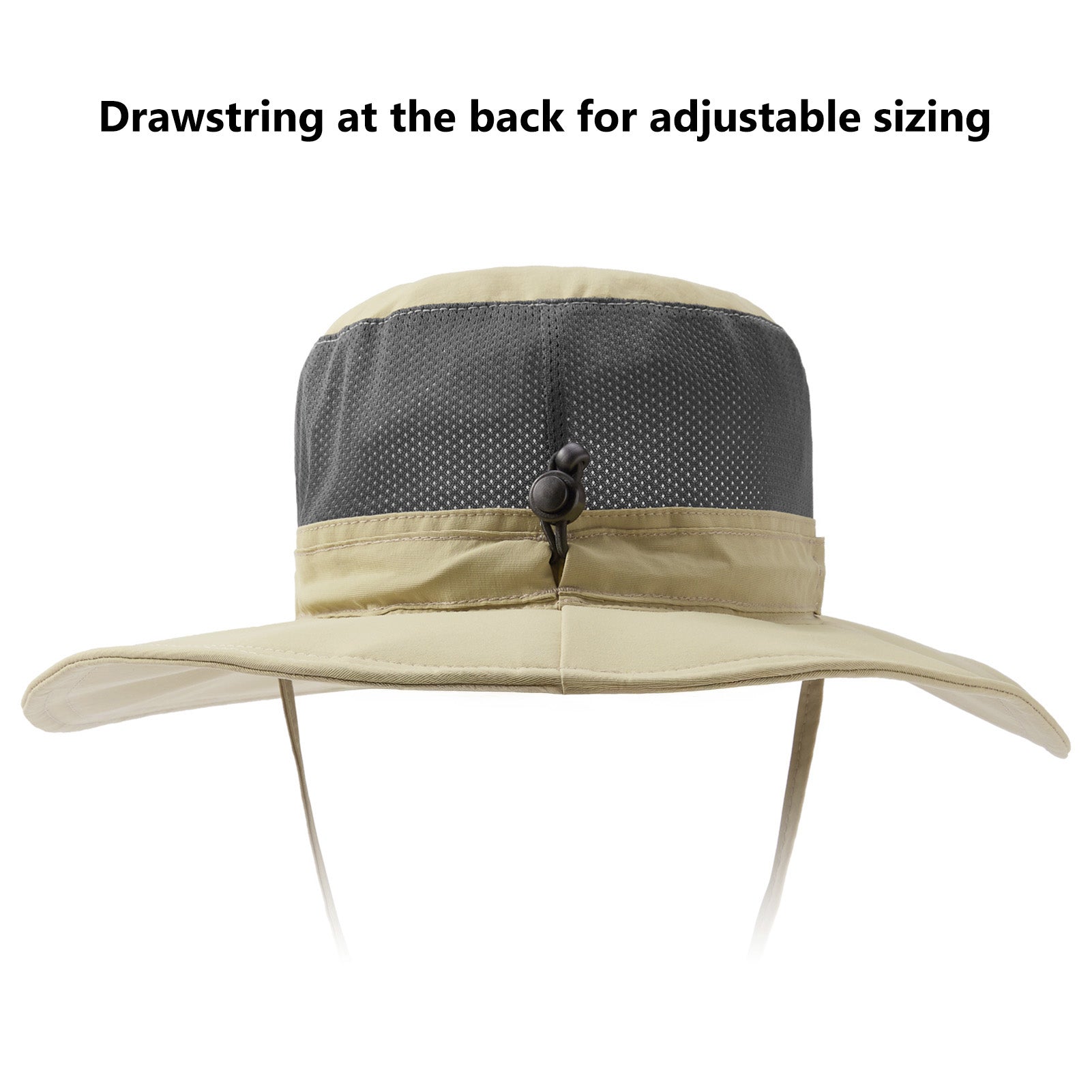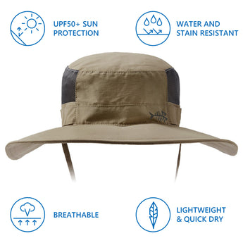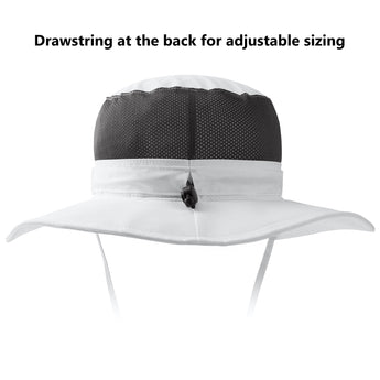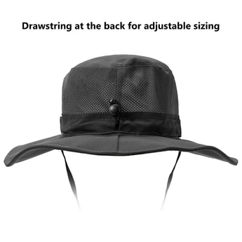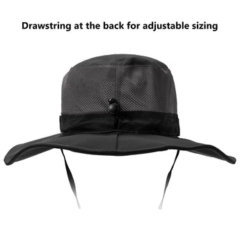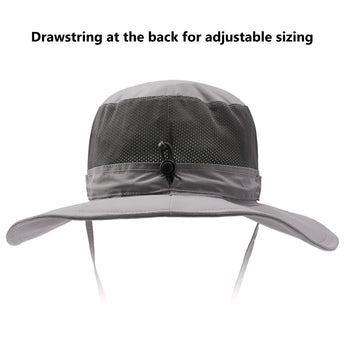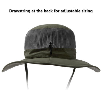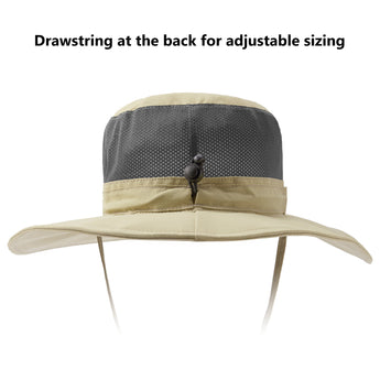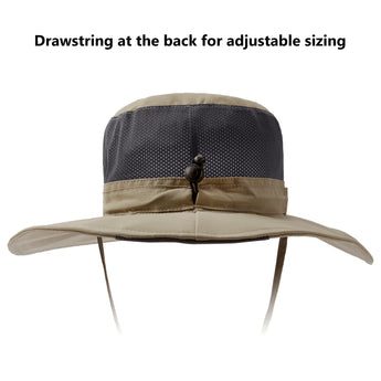 Our sun hat has a UPF 50+ rating, blocking over 98% of UVA/UVB rays. The wide brim shields your face and neck, and mesh panels enhance breathability. Made of quick-dry, water-resistant fabric, it's easy to clean and dries fast. Available in Medium and Large sizes, it's adjustable and unisex, with a drawstring and chin strap for windy days. Perfect for outdoor activities, it can be hand-washed and dried in the shade.