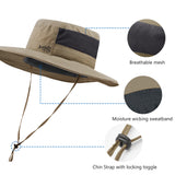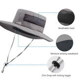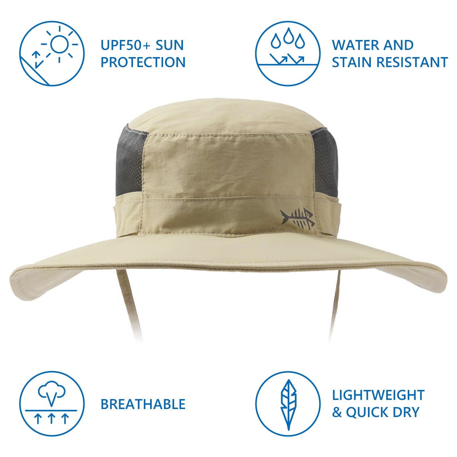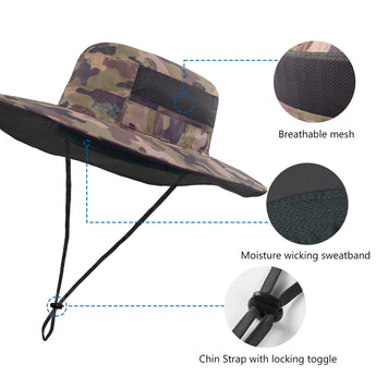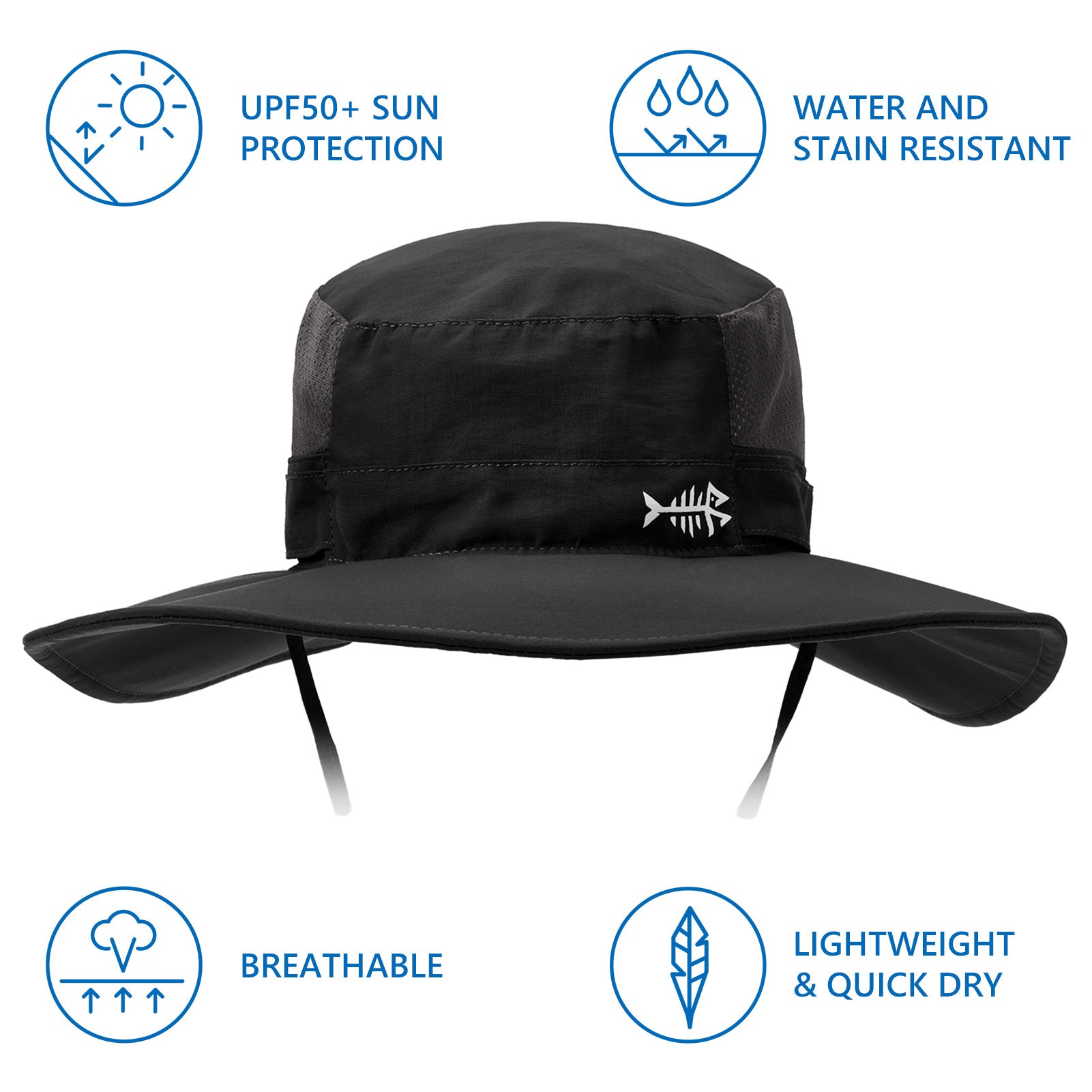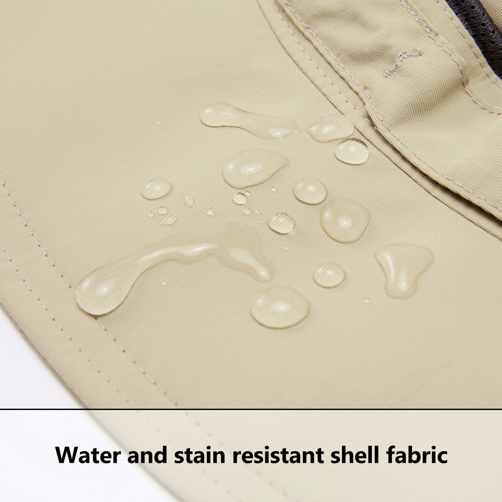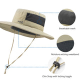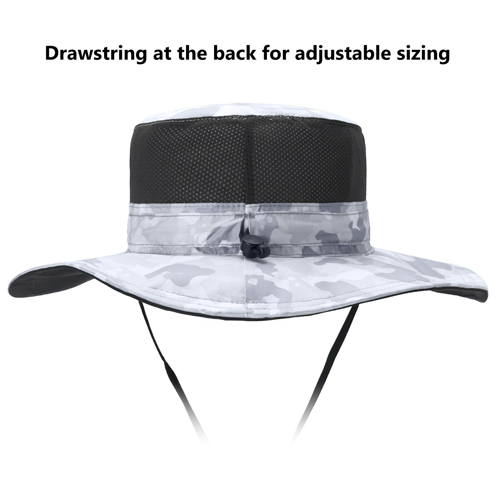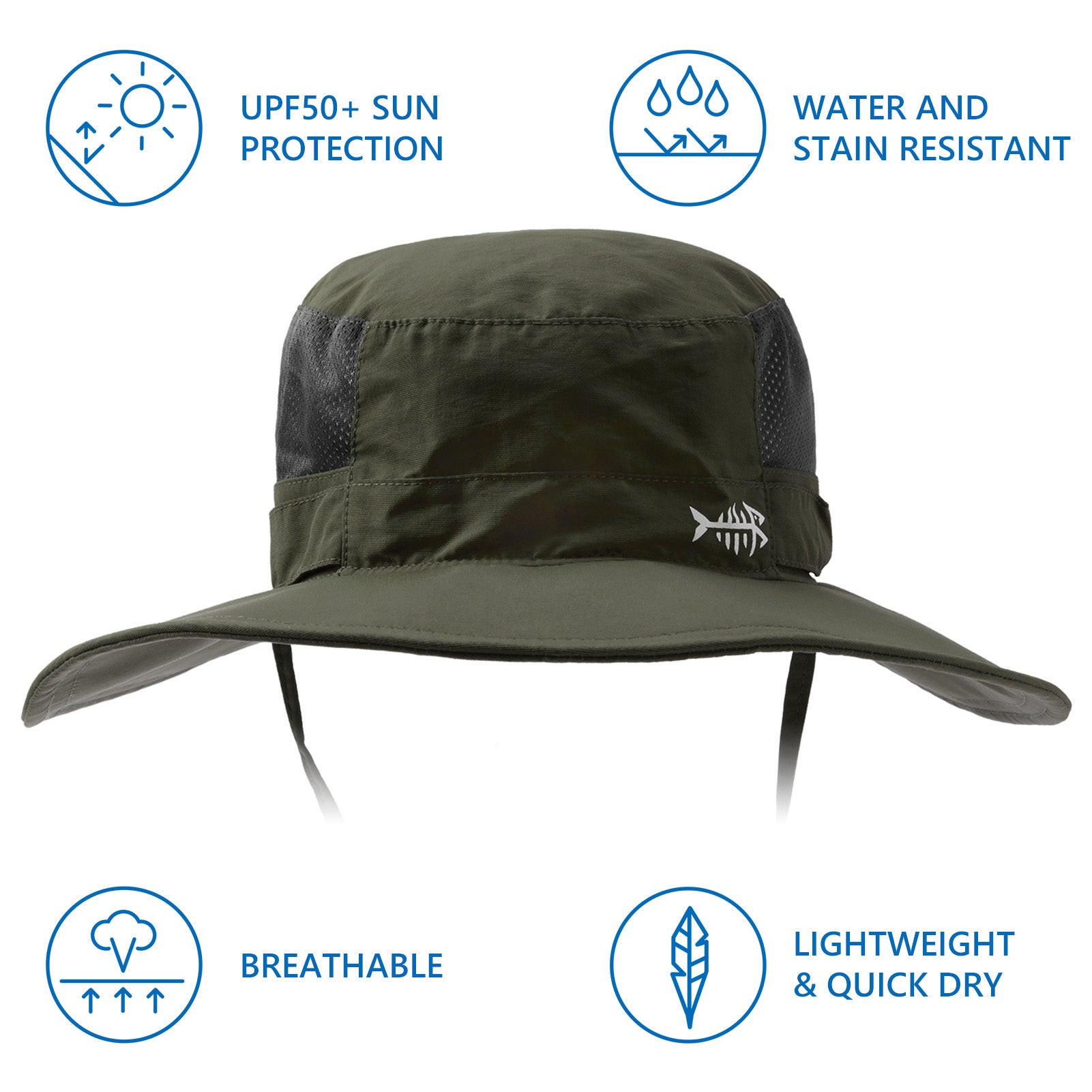 Our sun hat has a UPF 50+ rating, blocking over 98% of UVA/UVB rays. The wide brim shields your face and neck, and mesh panels enhance breathability. Made of quick-dry, water-resistant fabric, it's easy to clean and dries fast. Available in Medium and Large sizes, it's adjustable and unisex, with a drawstring and chin strap for windy days. Perfect for outdoor activities, it can be hand-washed and dried in the shade.