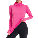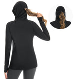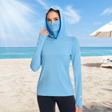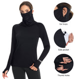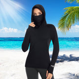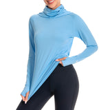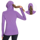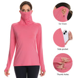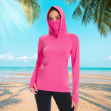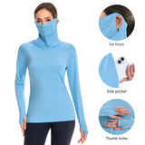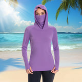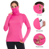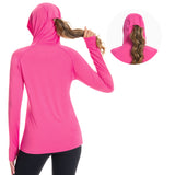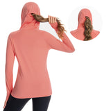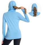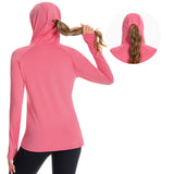 The BASSDASH women's hoodie shirt is equipped with a neck gaiter and a hood with a ponytail opening and thumb holes for maximum sun protection. It is also designed to be breathable and moisture wicking, making it suitable for any outdoor activities.