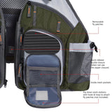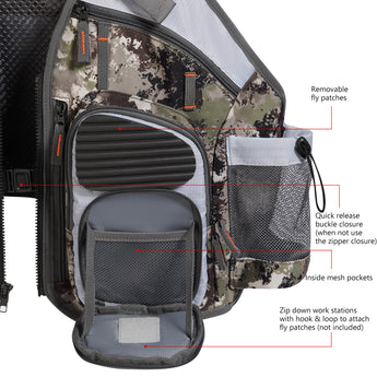 - 20-pocket design to keep all of your tackle organized - multiple interior and exterior storage pockets including 15 zippered pockets with smooth zippers; Dual front zip down work stations with loop side of hook-and-loop to attach the removable fly patches; Hydration compatible rear mesh storage pocket