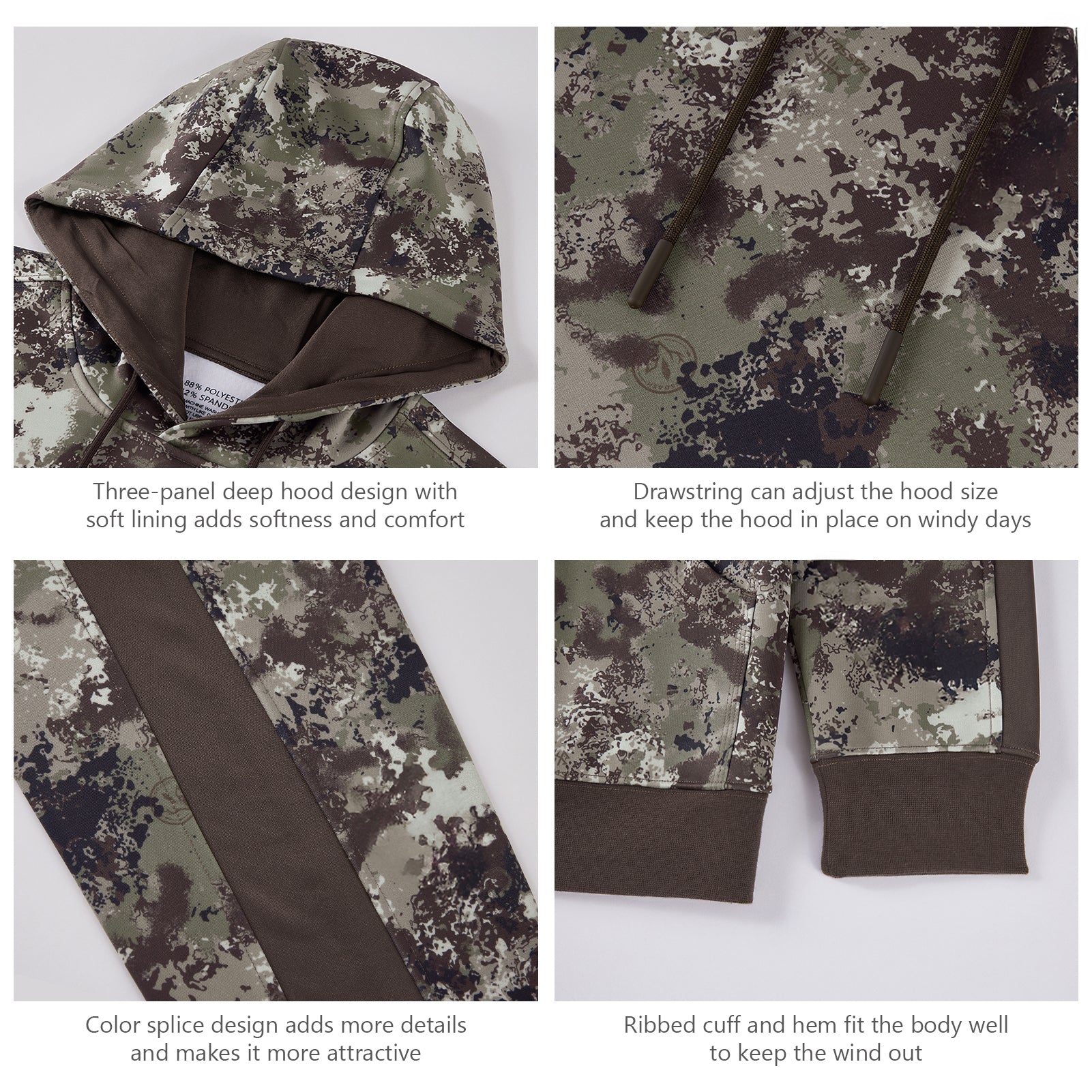 - Three-panel, double layered deep hood with a drawstring to adjust the hoodie fit to add extra coverage and warmth for your head and ears on windy or chilly days.