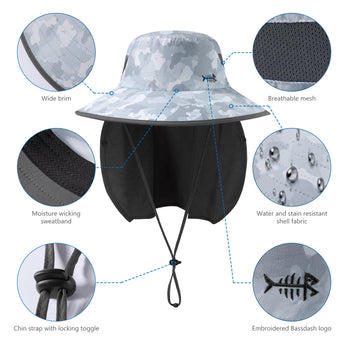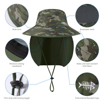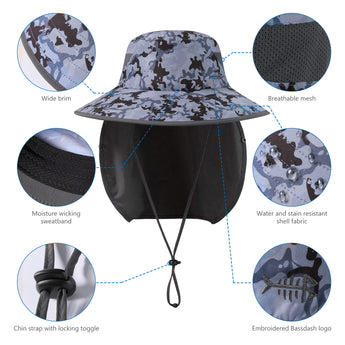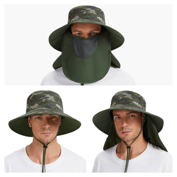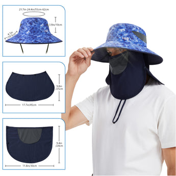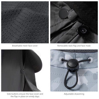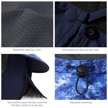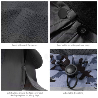 - Features wide brim, and removable face cover & neck flap to protect you against harmful UV rays from different angles and offer 360-degree sun protection for your face, ears and neck; The face cover and neck flap are detachable to provide multiple wearing ways to fit your different needs.