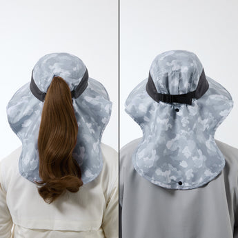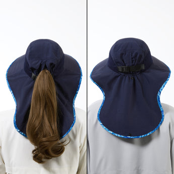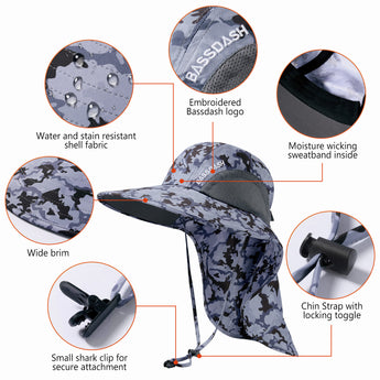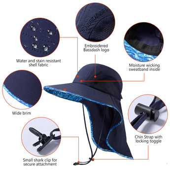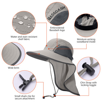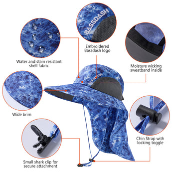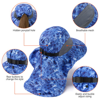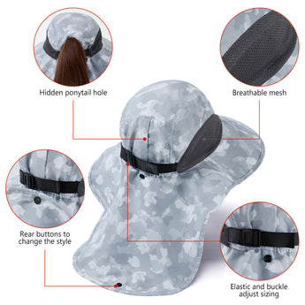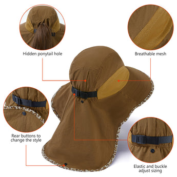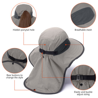 The hidden ponytail hole can keep your hair up and off your neck to make you cooler, and the hole is unobvious when it is not in use; The back buttons are designed to allow you to lift the neck cape for added breathability and that meanwhile changes the style; A small shark clip on the chin strap for secure attachment of your hat to your other gears like backpack, wader, etc.