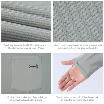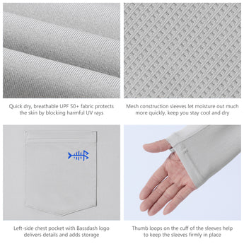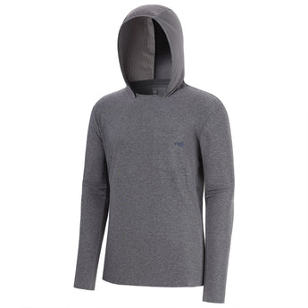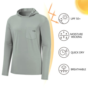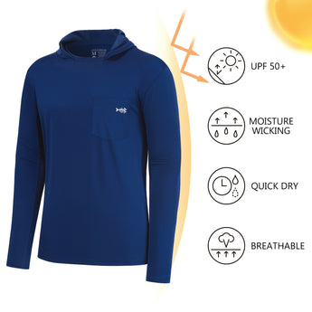 Our UPF men pocket hoodie shirts are made from 84% Polyester and 16% Spandex - these shirts offer perfect stretchability and durability. Mesh panels under the sleeves and at two sides of the hat enhance breathability and wick moisture. A comfortable hood provides extra sun protection for your neck, face, and ears, while thumb loops on the cuffs ensure the sleeves stay in place for added coverage. A left-side chest pocket for convenient storage and enhances your look. Perfect for daily wear and outdoor activities like fishing, hiking, kayaking, and more.