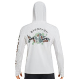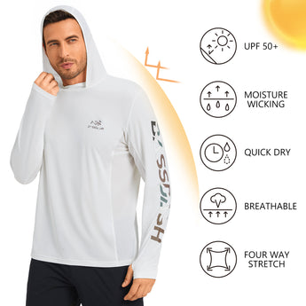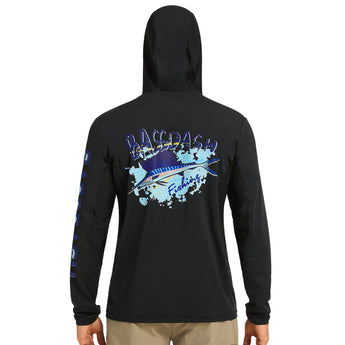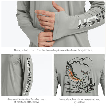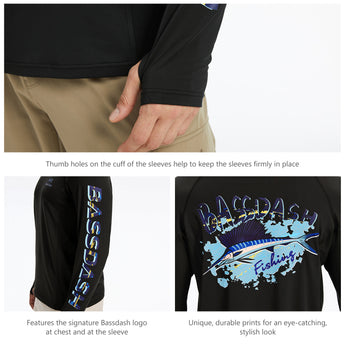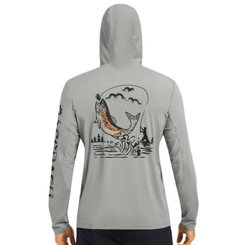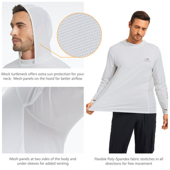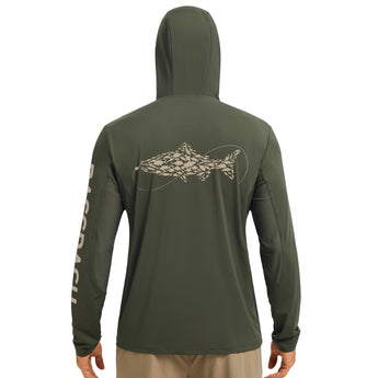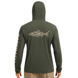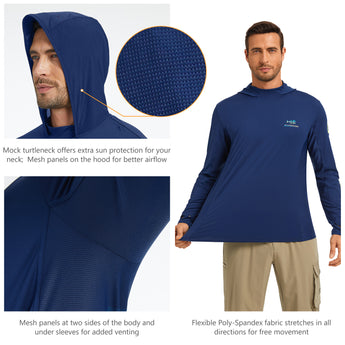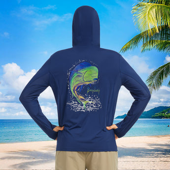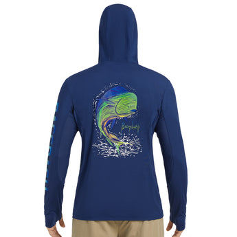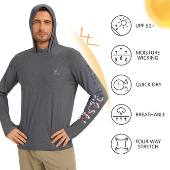 The long sleeve sun shirt mens blocks 98% of harmful UV rays. The mens hooded sun shirt has a mock neck and thumbhole sleeves to protect your neck and hands from sunburn. Breathable mesh panels increase airflow, and moisture-wicking fabric keeps you dry all the time. The lightweight design allows easy movement. Wear it alone or as a base layer for kayaking and offshore trips. The bright graphics stay vibrant, and the fabric is durable against saltwater. It's great for fishing or as a gift for outdoor lovers.