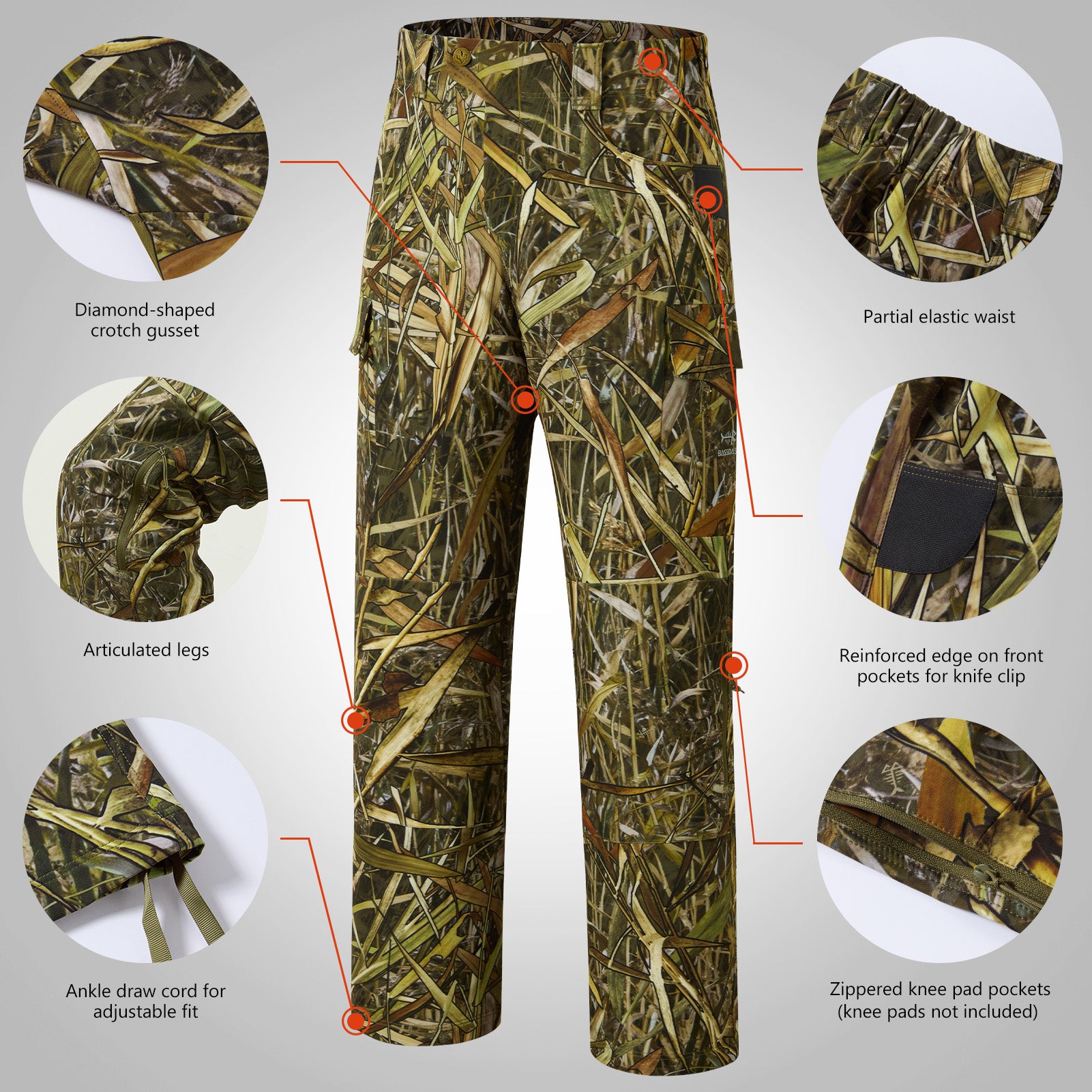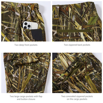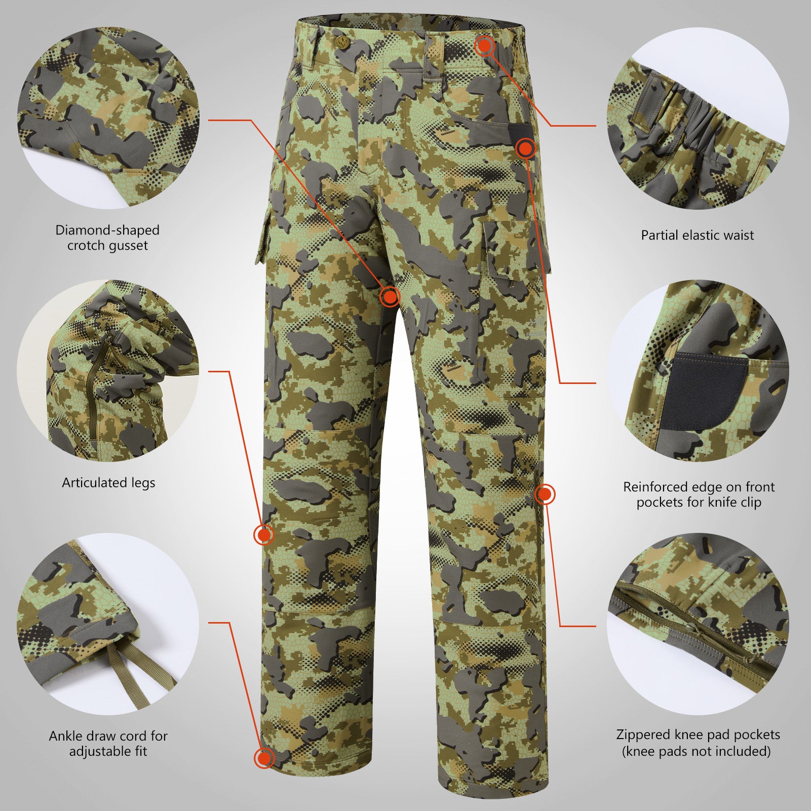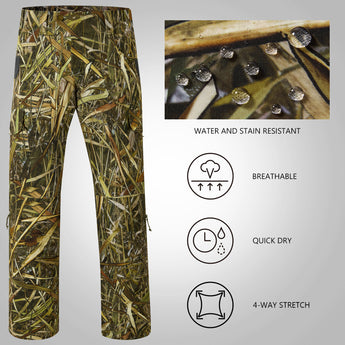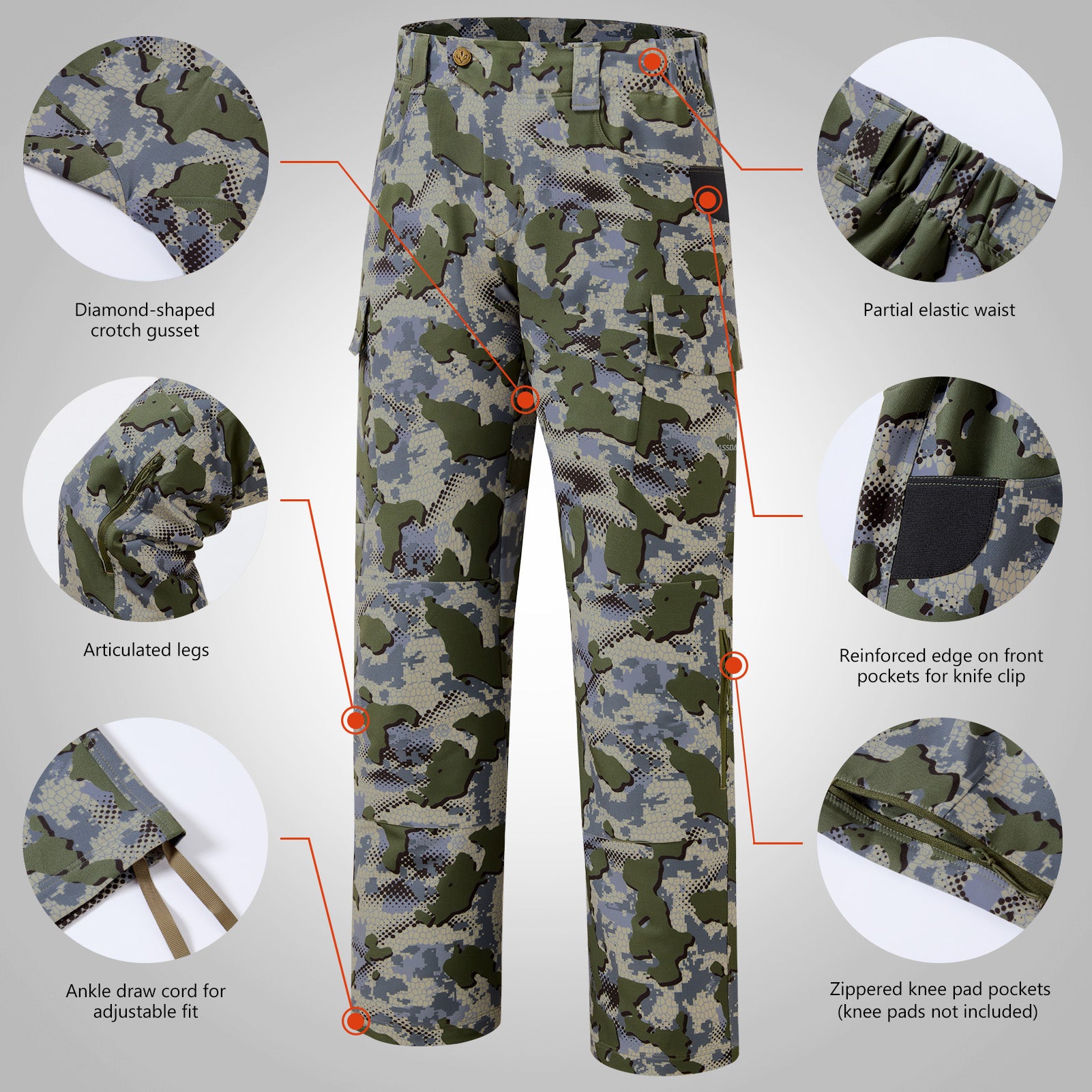 The camo hunting pants can be worn alone for early hunting season. Four-way stretch fabric with waterproof treatment on camo pants enables you freedom of movement and great comfort for long miles in the field.