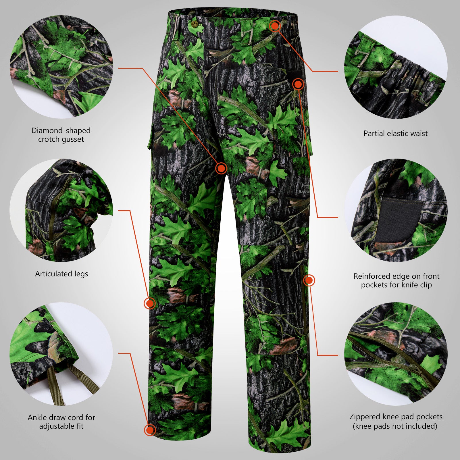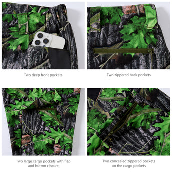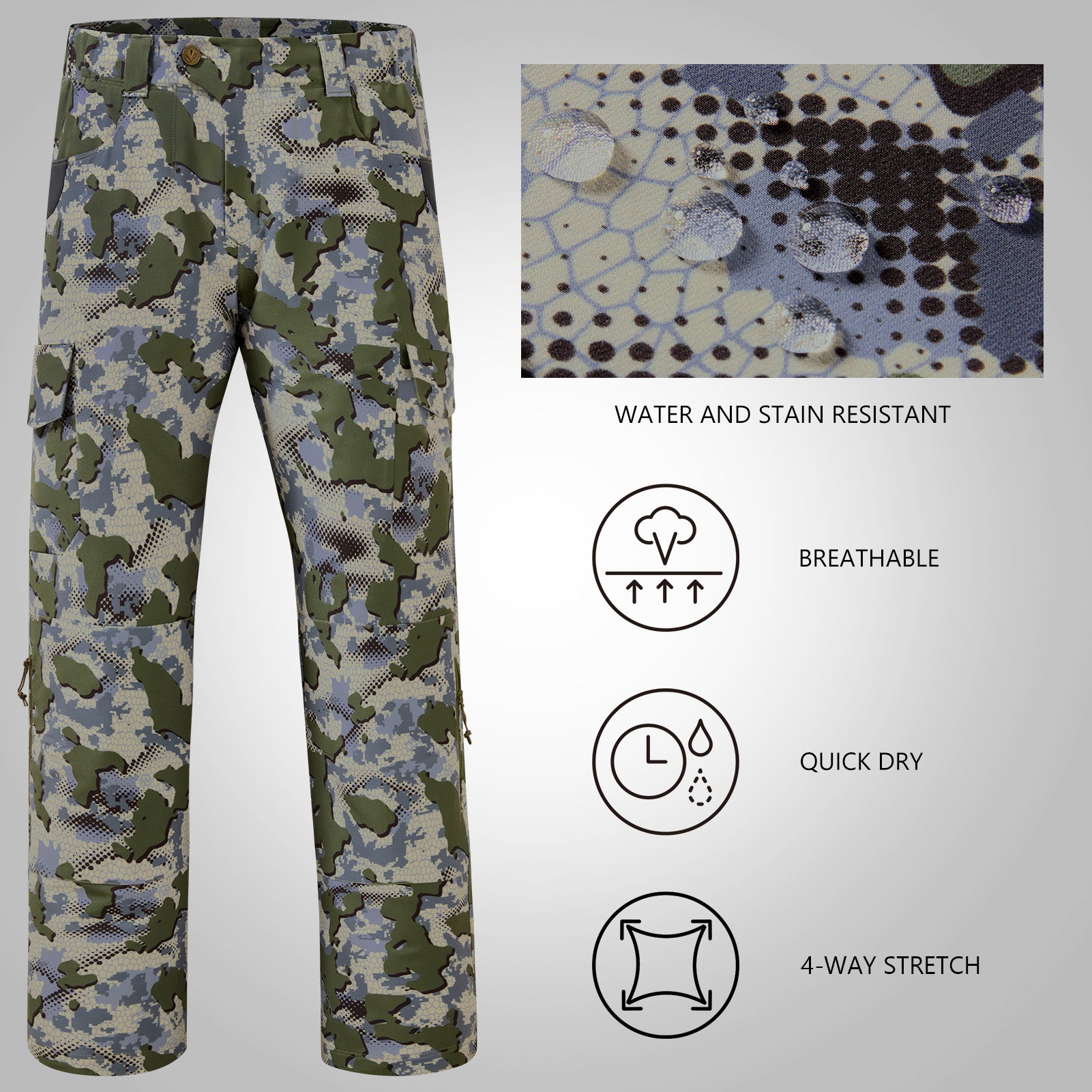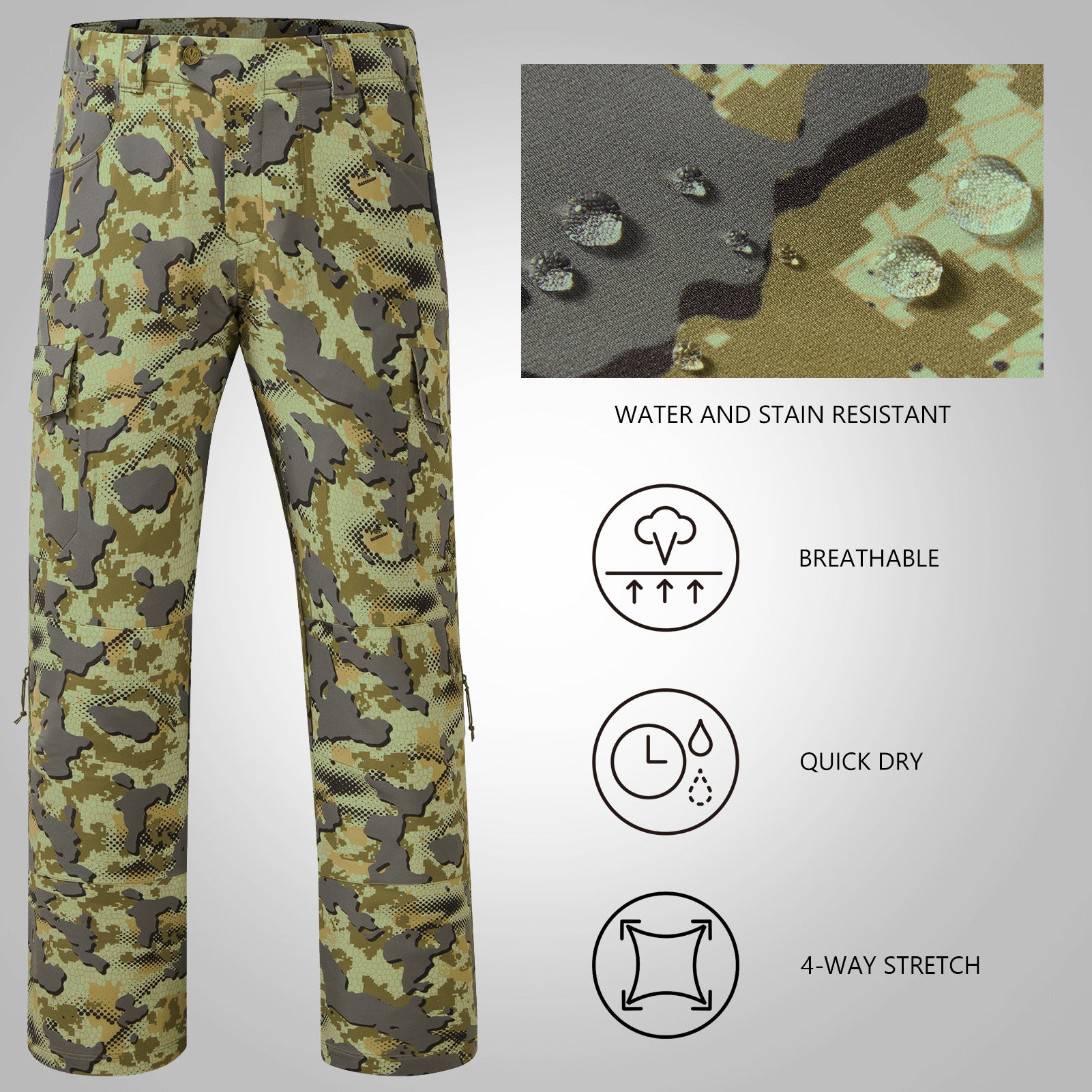The camo hunting pants can be worn alone for early hunting season. Four-way stretch fabric with waterproof treatment on camo pants enables you freedom of movement and great comfort for long miles in the field.