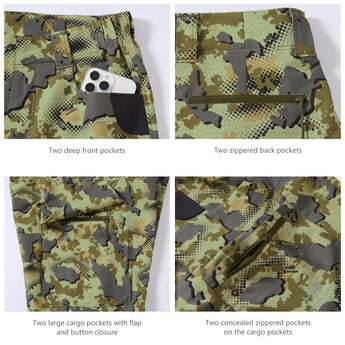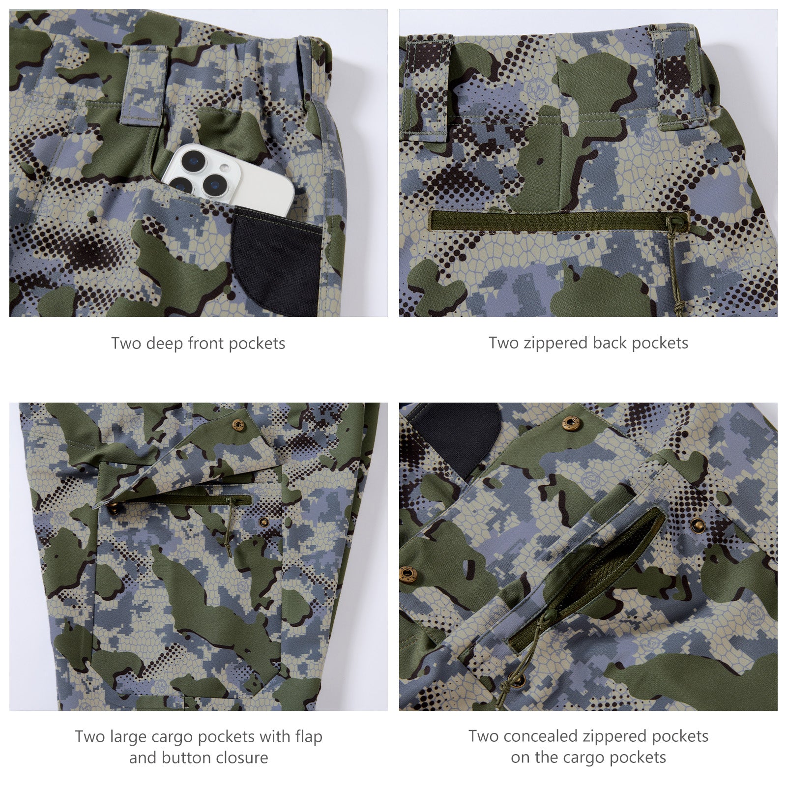 3. Eight-pocket design to ensure you can access to your essentials conveniently and quietly: Two deep front pockets, two cargo pockets with flap and button closure, two concealed zippered pockets on the cargo pockets, and two mesh lined zippered back pockets that allow venting heat for added breathability when you unzip them.