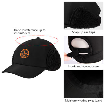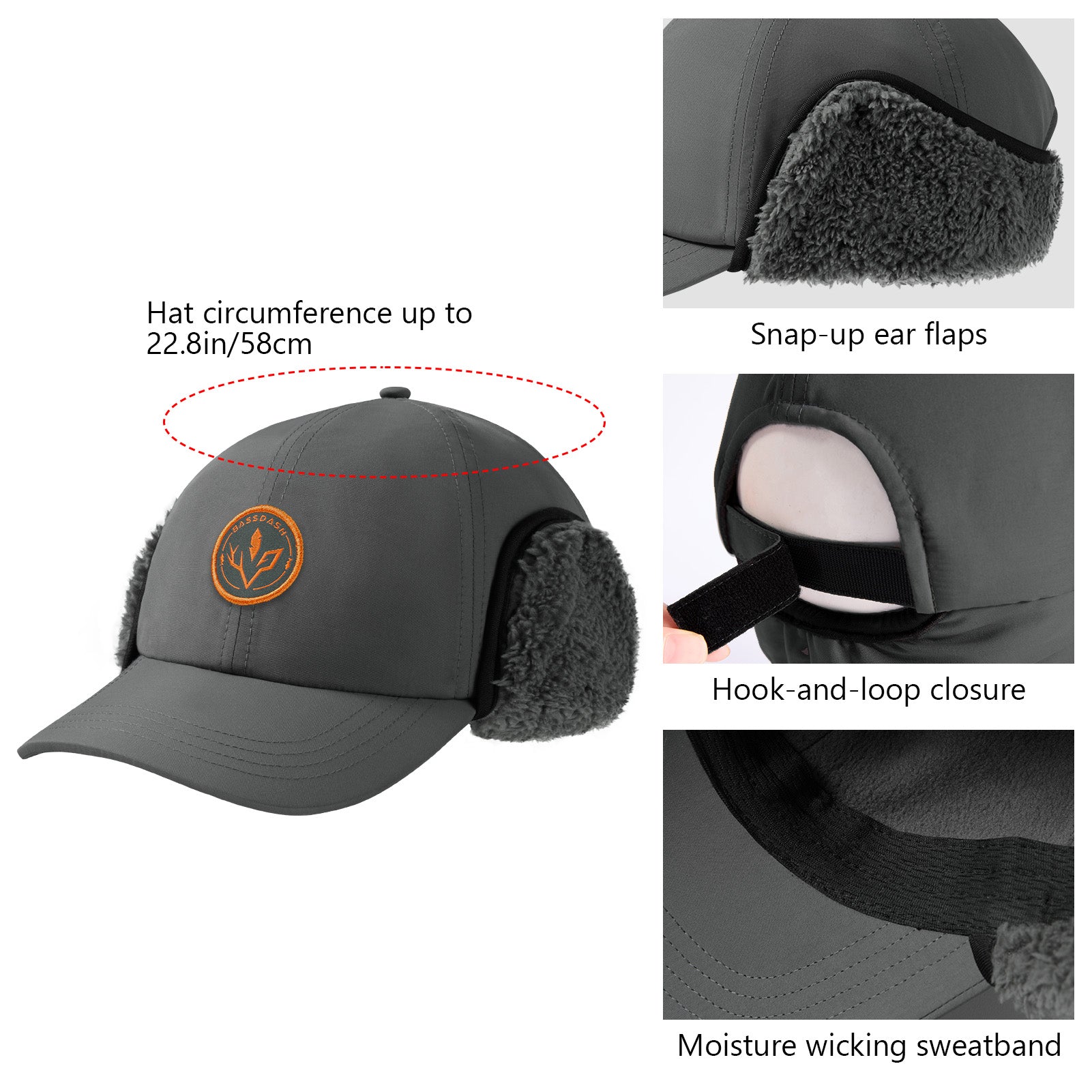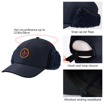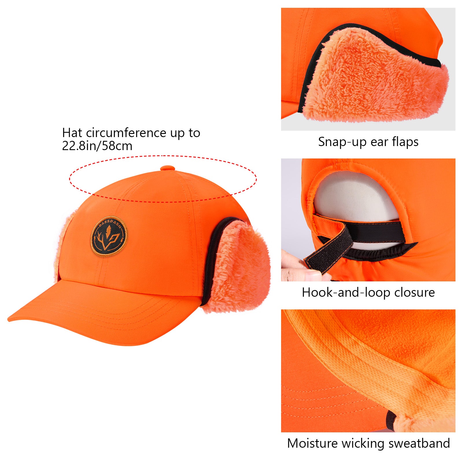 Designed for the outdoors, the fleece ear flap hats features soft fleece lining and a water-resistant, windproof shell for reliable warmth and dryness. The snap-up fleece ear flaps are  desinged for adjustable protection, and an elastic adjustable back with hook-and-loop closure for a secure fit (fits head size up to 24in/61cm). Available in solid colors and functional camouflages for effective concealment. Ideal for hunting, fishing, hiking, camping and more.