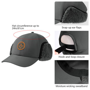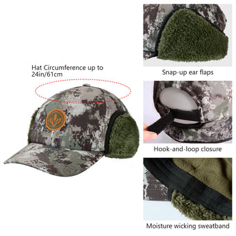 Designed for the outdoors, the fleece ear flap hats features soft fleece lining and a water-resistant, windproof shell for reliable warmth and dryness. The snap-up fleece ear flaps are desinged for adjustable protection, and an elastic adjustable back with hook-and-loop closure for a secure fit (fits head size up to 24in/61cm). Available in solid colors and functional camouflages for effective concealment. Ideal for hunting, fishing, hiking, camping and more.