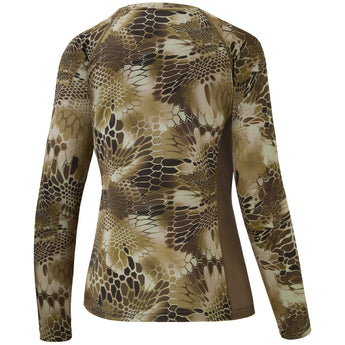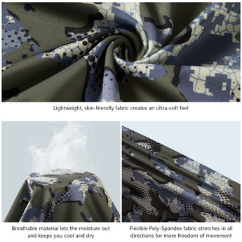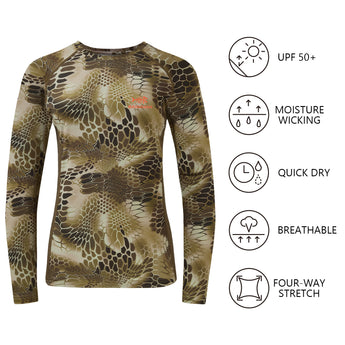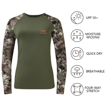 - This long sleeve camo shirt in a feminine cut is a must for ladies¡¯ hunting adventure; The 4-way stretch material and raglan sleeve design improve the flexibility to provide more freedom of movement; The mesh panels on either side of the shirt allow more air flow.
