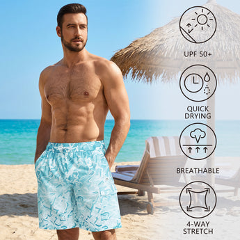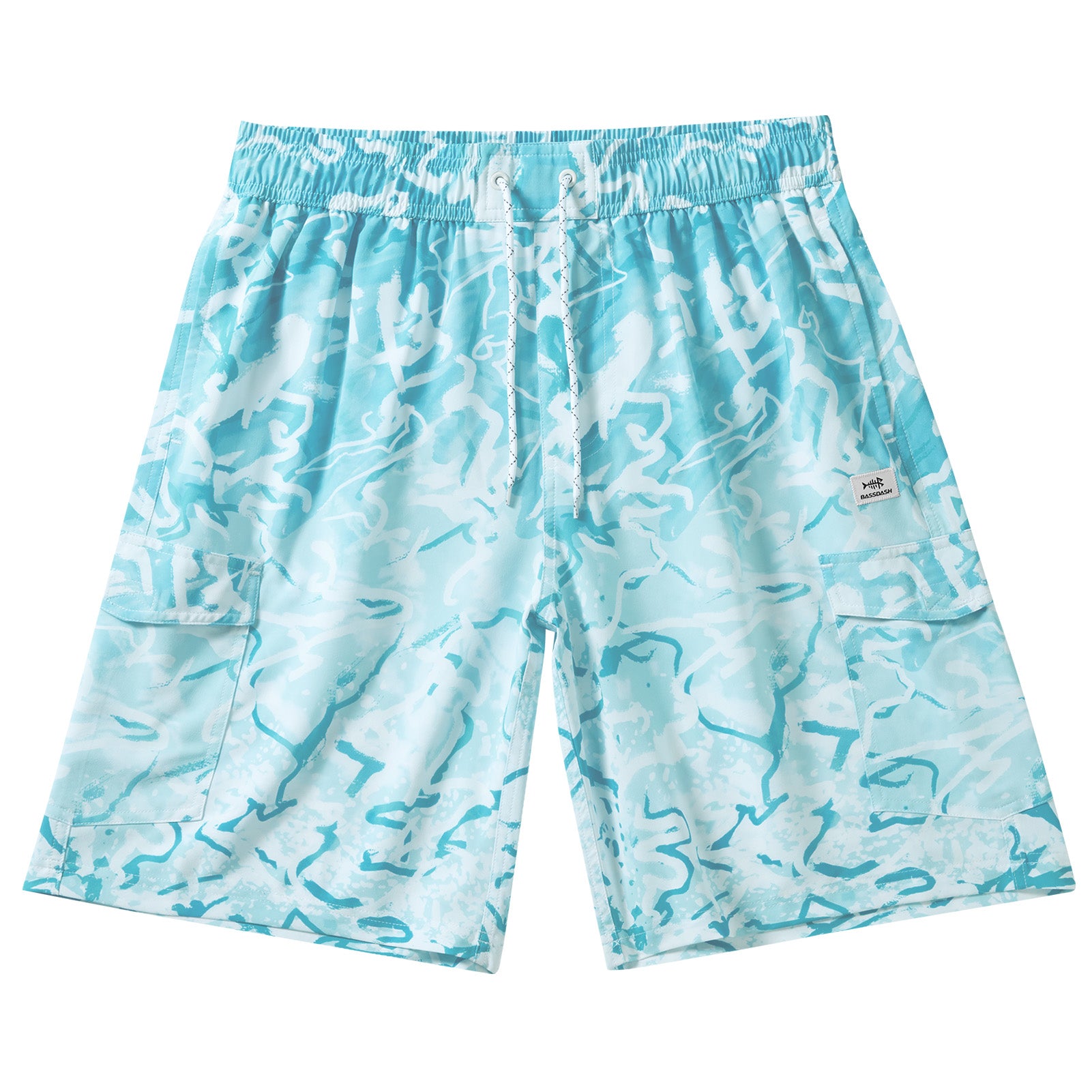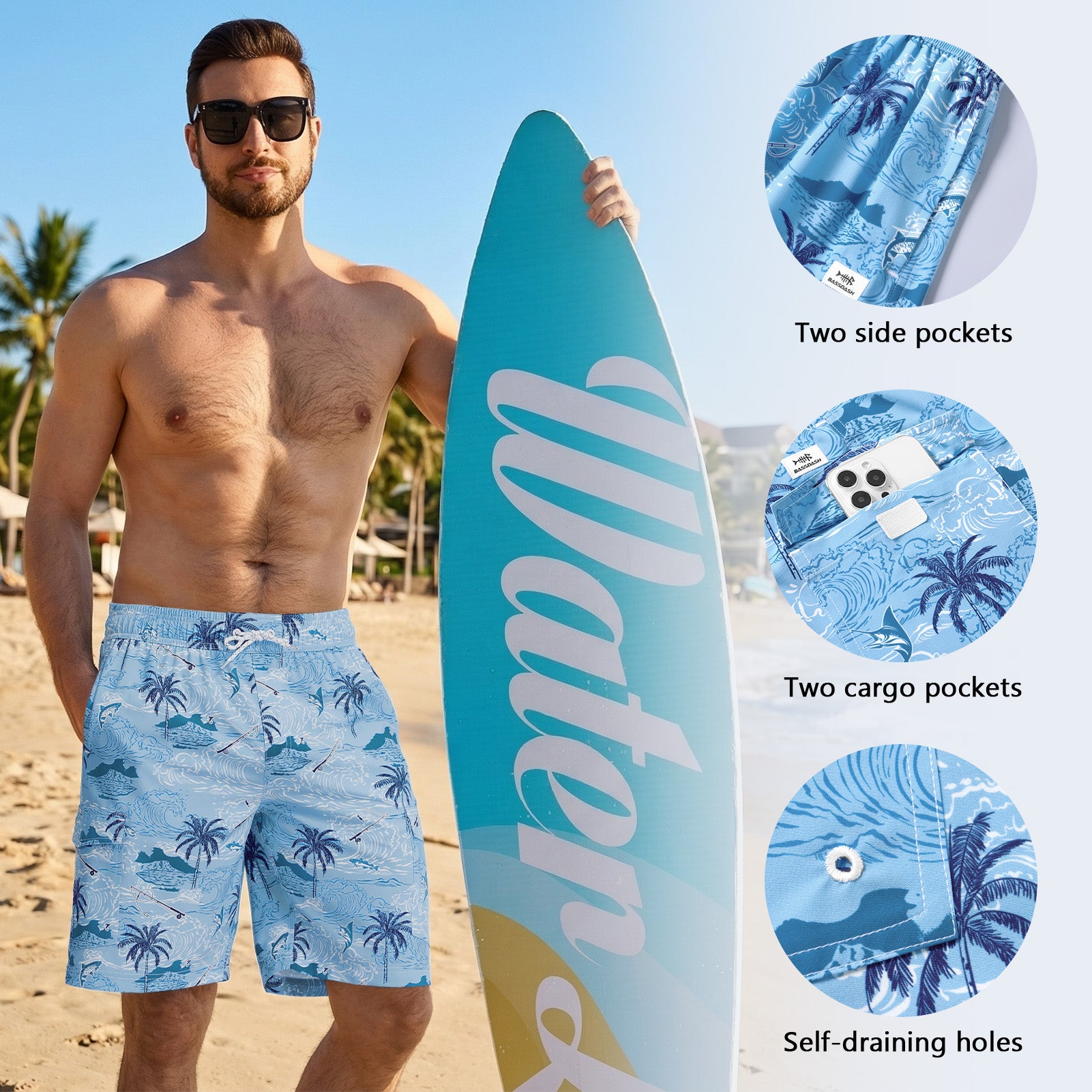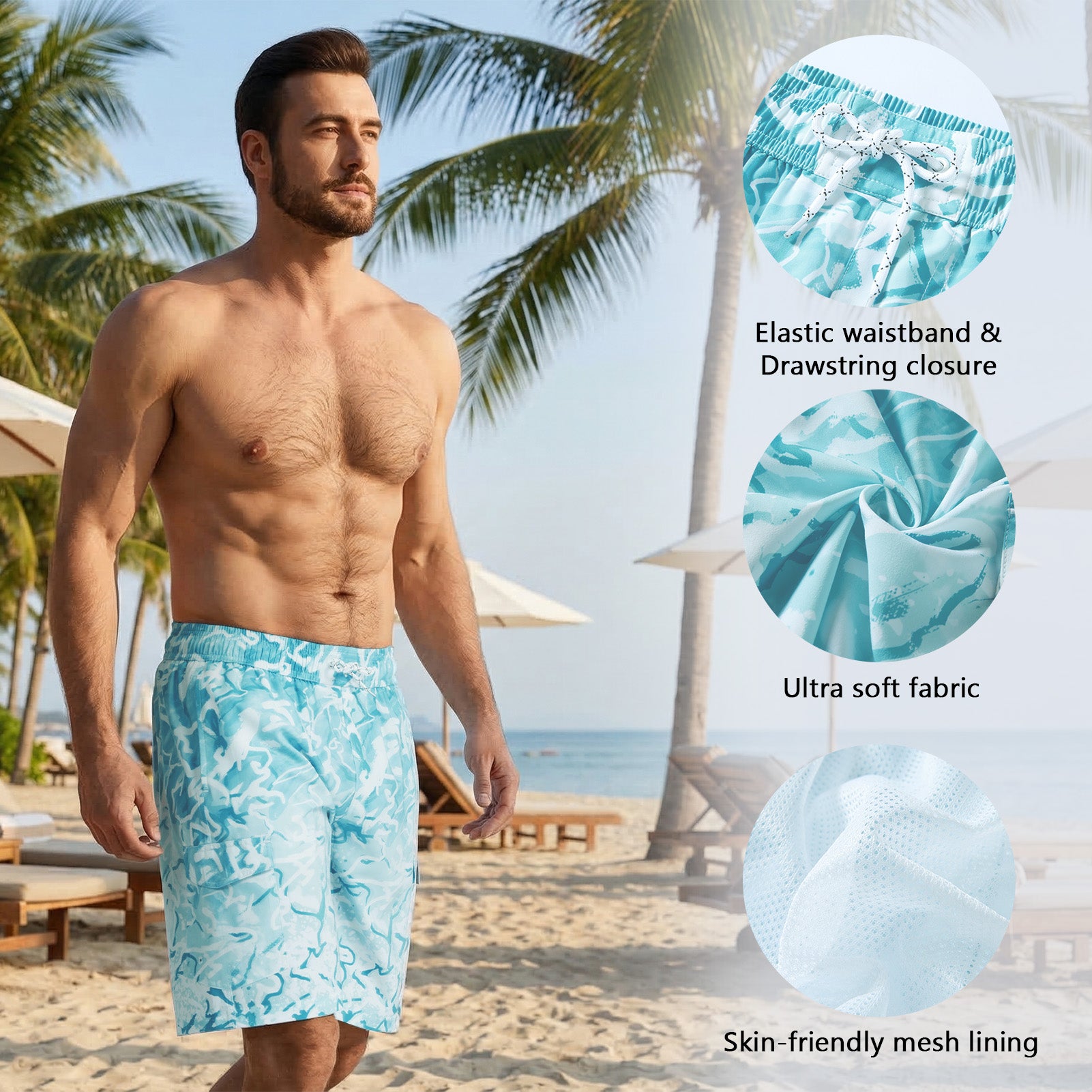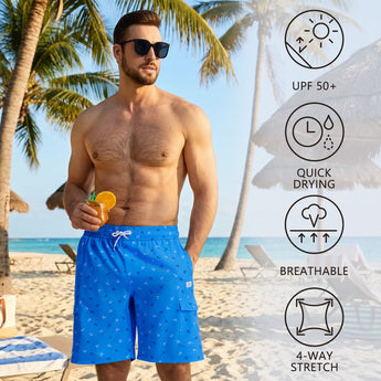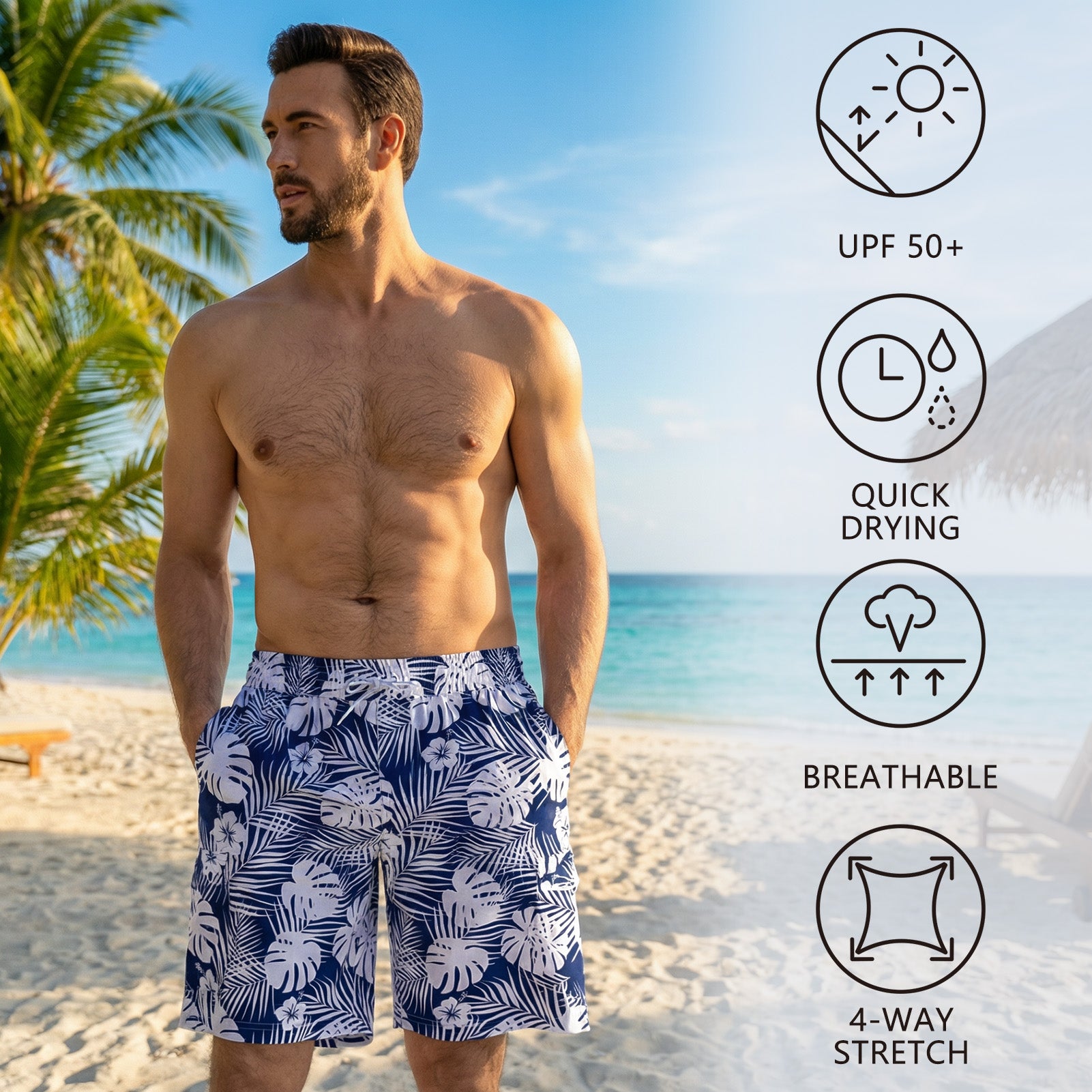 Crafted from a quick-drying, UPF 50+ fabric with four-way stretch (92% polyester, 8% spandex) and a chlorine-resistant print, these board shorts feature an adjustable drawstring waist, a supportive mesh liner, and four durable pockets. The knee-length design provides full coverage and unrestricted mobility. Perfect for water sports like swimming, surfing and paddling, they are equally ideal for fishing, hiking, workouts, or everyday casual wear.