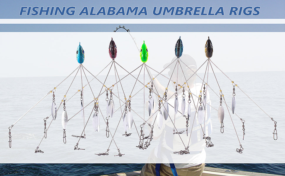 - The rig is a five wire Alabama style lure that incorporates four stainless steel blades midway down each outer arm to produce tremendous flash and vibration and create the image of a bigger school of bait to attack