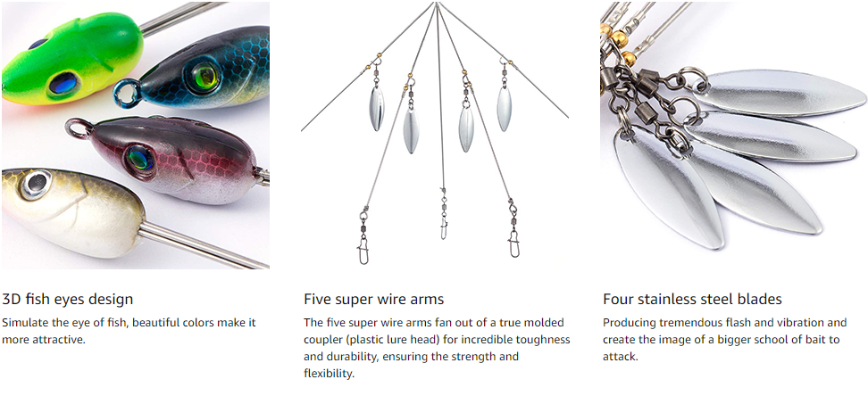 - The five super wire arms fan out of a true molded coupler (plastic lure head) for incredible toughness and durability, ensuring that the wire arms never break free
