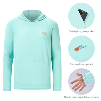 The hooded t shirts offer permanent UPF 50+ sun protection to block 98% of UVA/UVB rays. The UV shirt also features a convenient kangaroo pocket with a small pouch inside for personal items. The moisture-wicking fabric keeps you dry and cool, making it perfect for daily wear and outdoor activities. Whether you're spending a day at the beach, hiking, or simply enjoying the outdoors, you can relax knowing your skin is shielded from harmful sun exposure.
