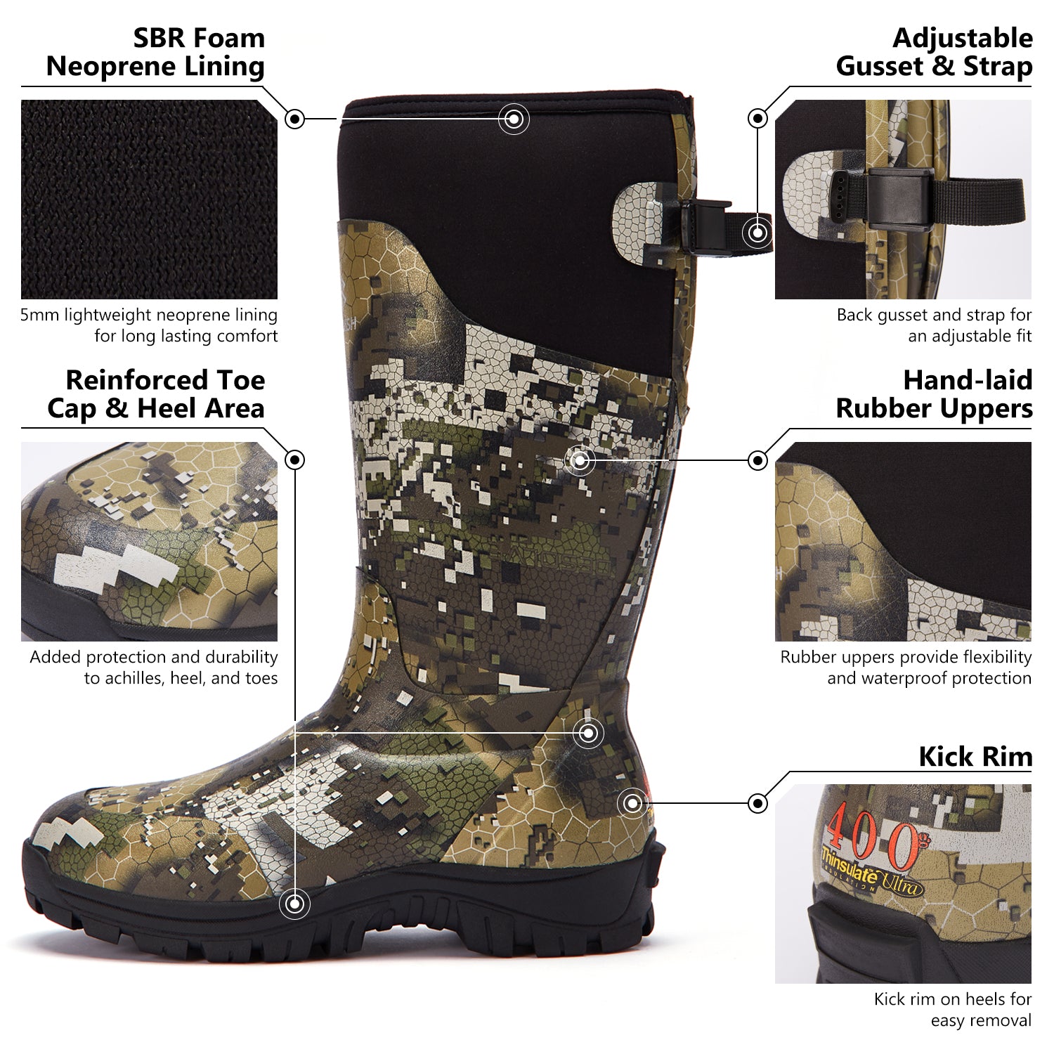 - 100% waterproof barrier allows moisture to escape without letting water in, keeping your feet dry, warm and comfortable all day long - 400 grams Thinsulate ultra insulation for warmth without bulk; 5mm lightweight, 4-way stretch SBR Foam Neoprene lining for long lasting comfort and added waterproof protection; Hand-laid rubber out layer provides flexibility and waterproof protection, and Scent-Free rubber construction enhances concealment.